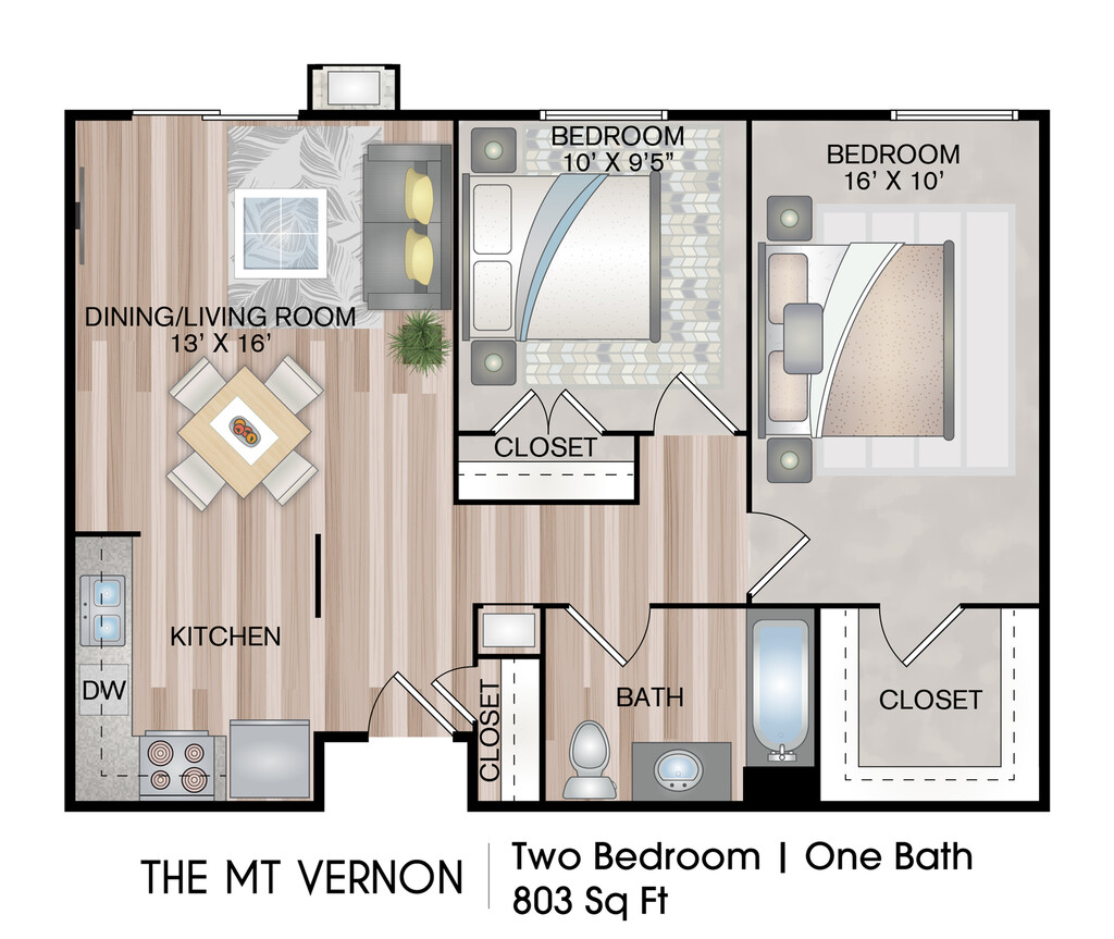 Apartment Model: The Mt. Vernon Premium Plus (Active Sr. Community)From $1,9652 Bedroom, 1 Bath, 803 sq ftAvailable Now![]()