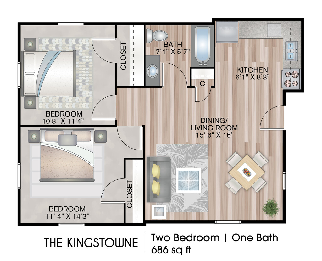 2 Beds, 1 Bath, 686 sq ftModel Gallery