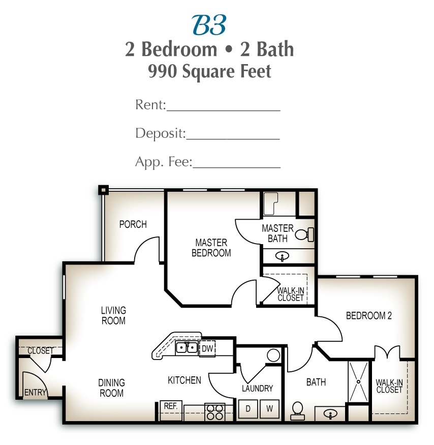 2 Beds, 2 Baths, 990 sq ftLargest 2 BedroomThis is the largest 2 Bedroom at this PropertyModel Gallery