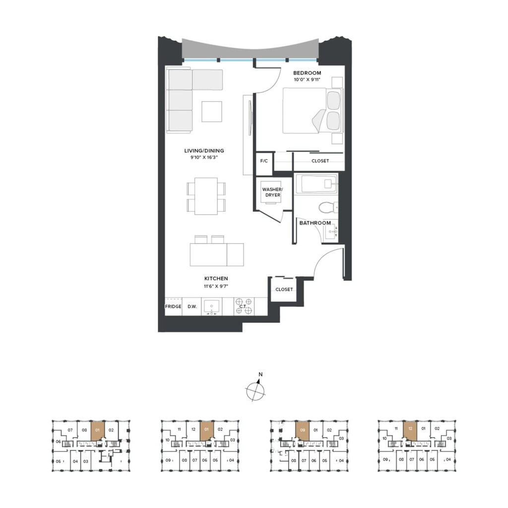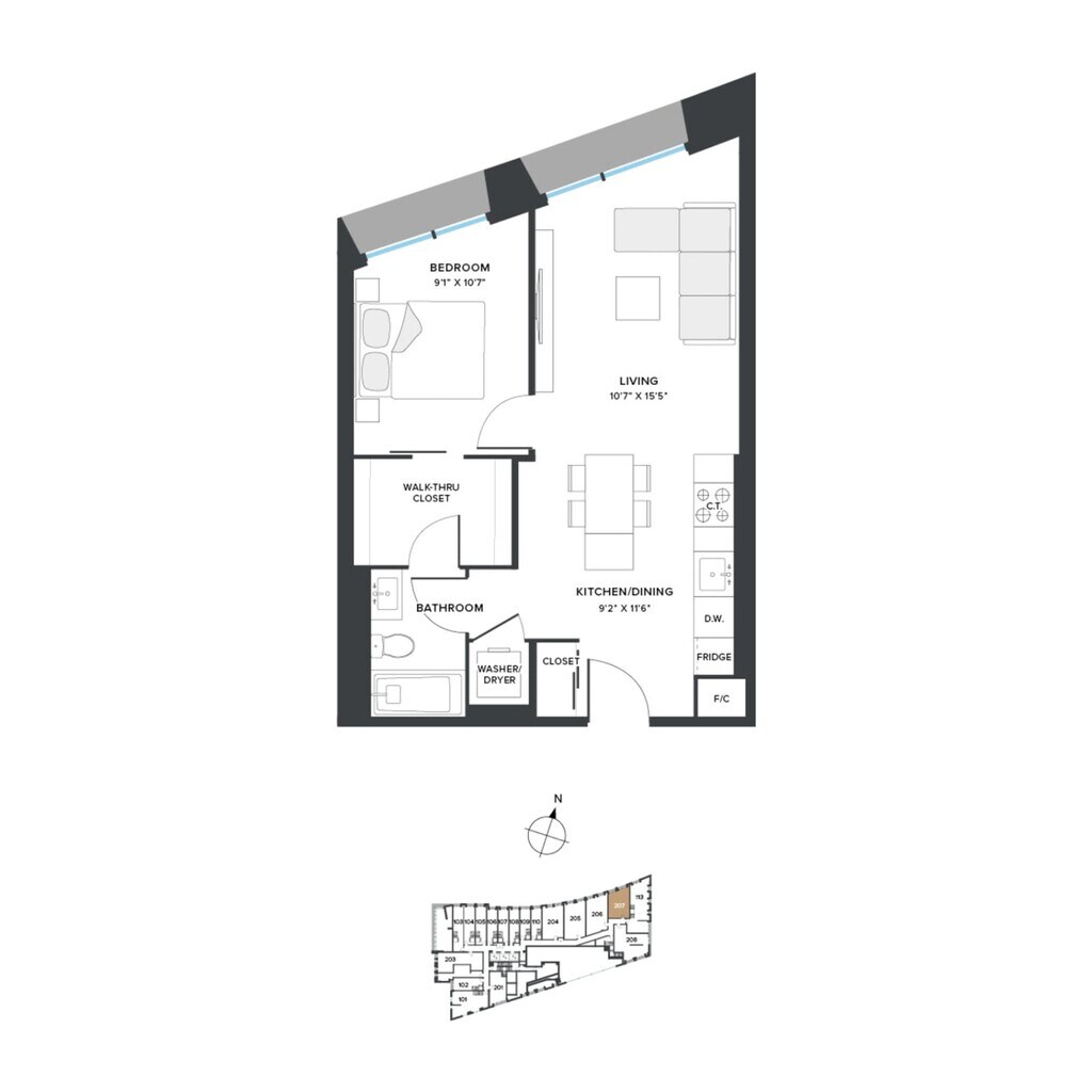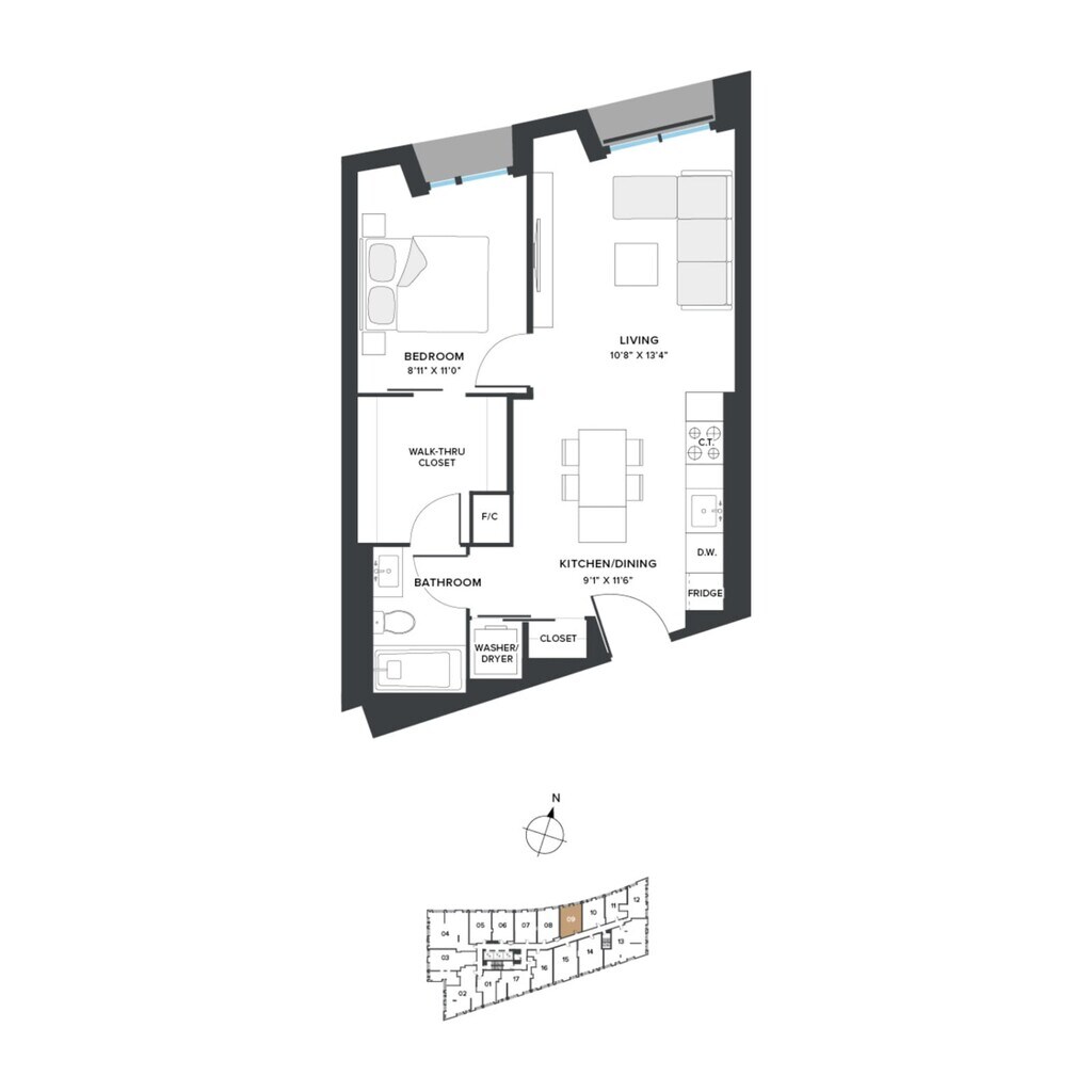 A16 - Floorplan 1 Apartment Unit: E0310Apartment Model: A16From $2,3681 Bedroom, 1 Bath, 569 sq ftAvailable NowFloorplan A11