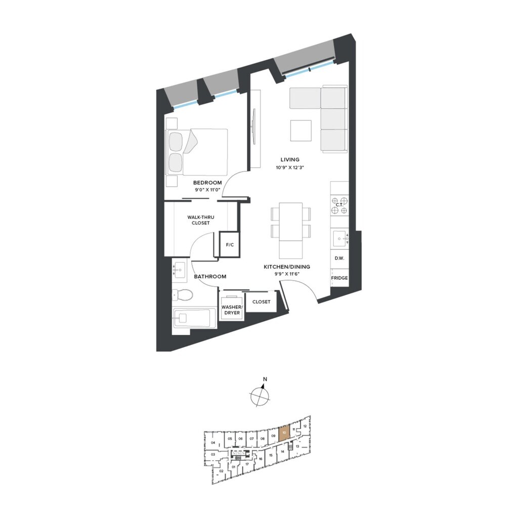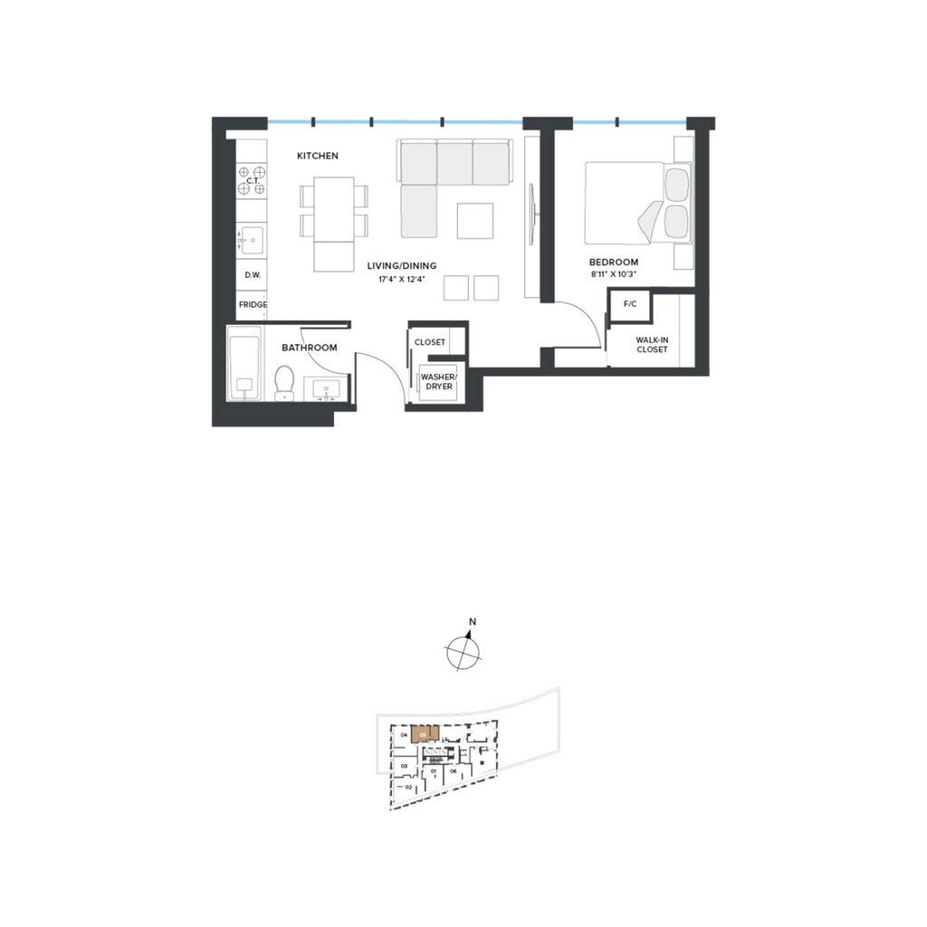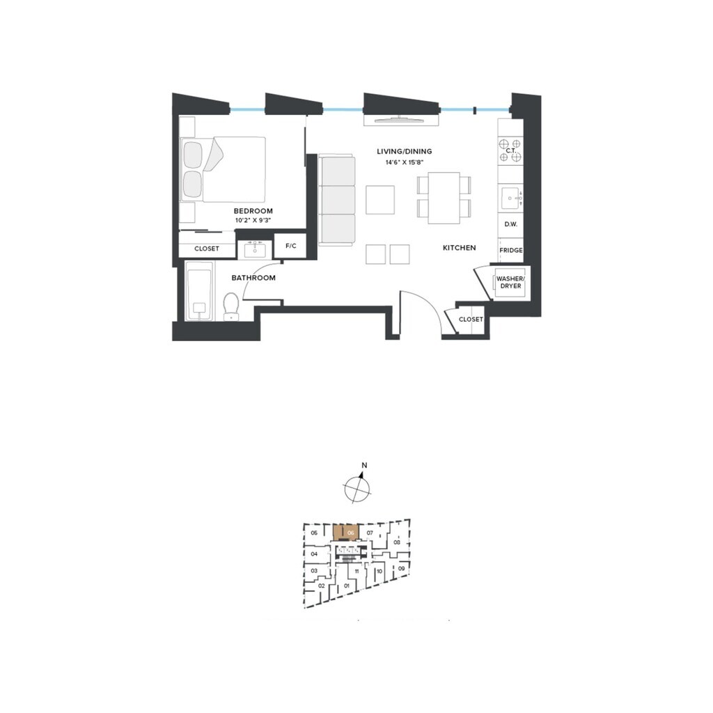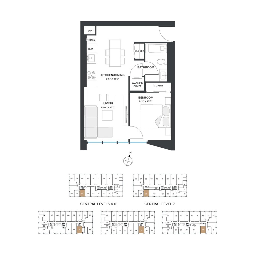 A16 - Floorplan 1 Apartment Unit: E0310Apartment Model: A16From $2,3681 Bedroom, 1 Bath, 569 sq ftAvailable NowFloorplan A11
