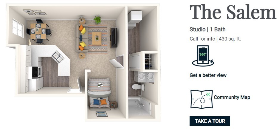 Apartment Model: The SalemFrom $1,358Studio, 1 Bath, 430 sq ftAvailable April 7, 2026Floor plans are artist's rendering. All dimensions are approximate. Actual product and specifications may vary in dimension or detail. Not all features are available in every rental home. Please see a representative for details.