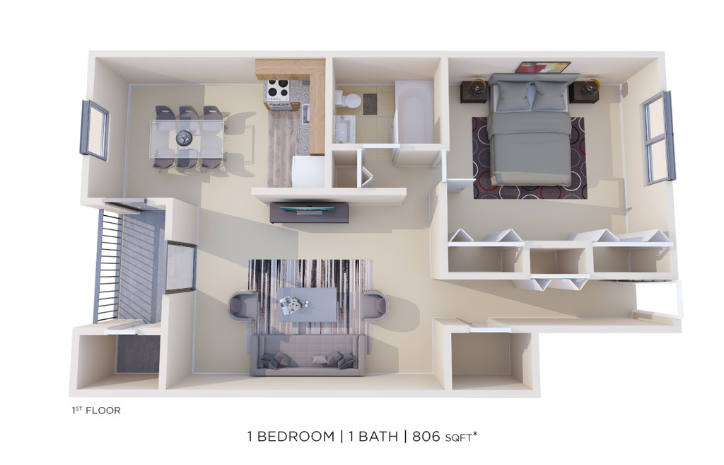 Apartment Model: One BedroomFrom $1,3751 Bedroom, 1 Bath, 797-806 sq ftAvailable Now![]()