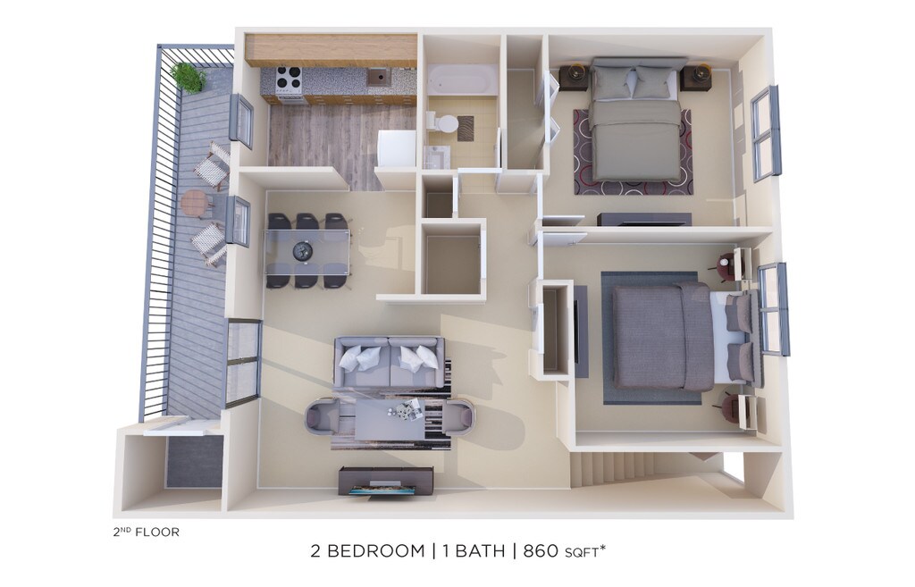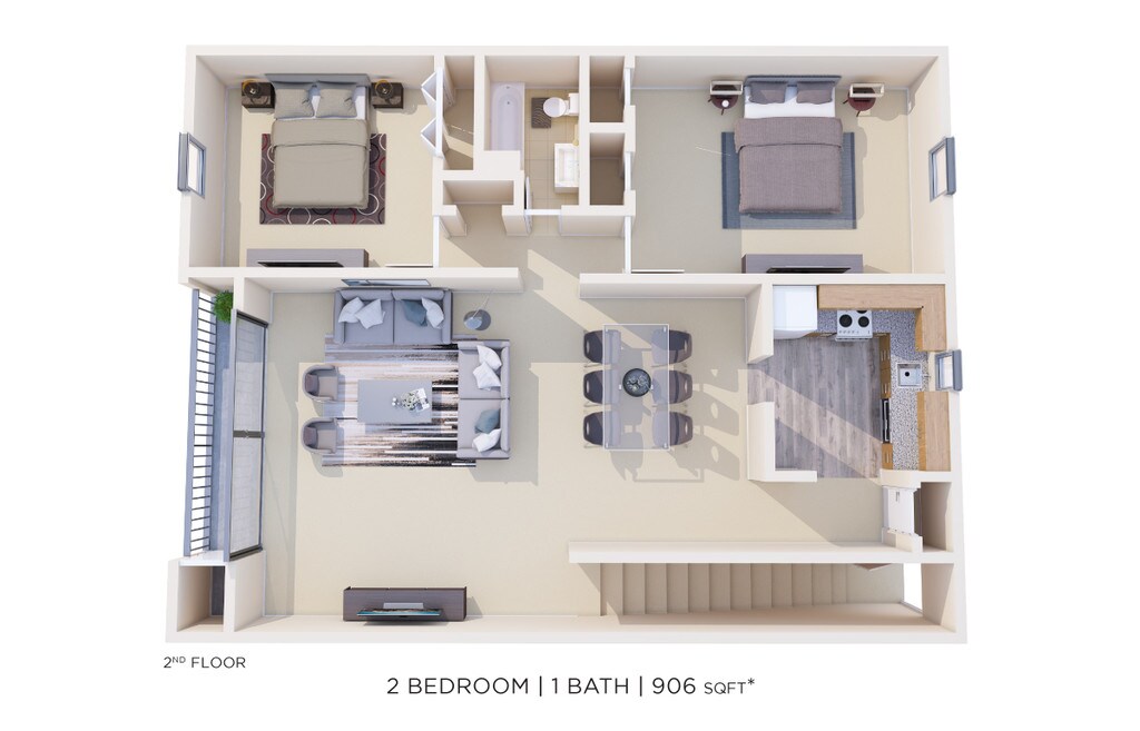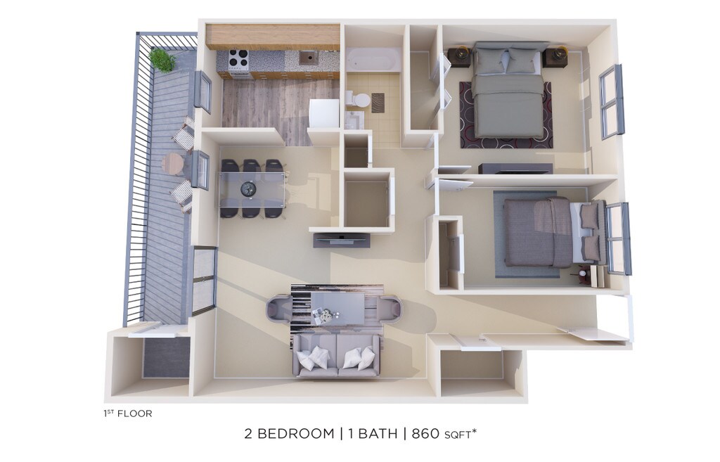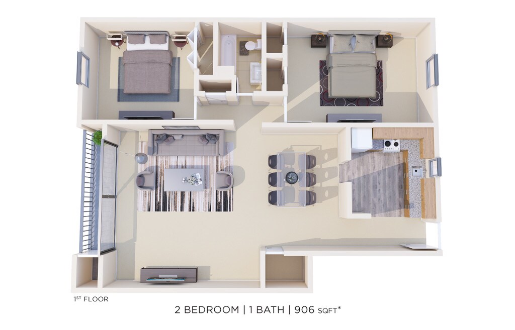 2 Beds, 1 Bath, 860-906 sq ftAvailable NowModel Gallery