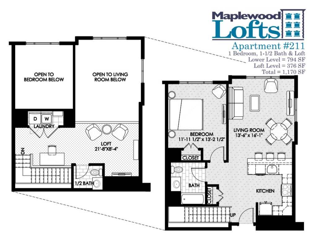 1 Bedroom 1.5 Bath w/ Loft - Floorplan 16 2 Bedrooms