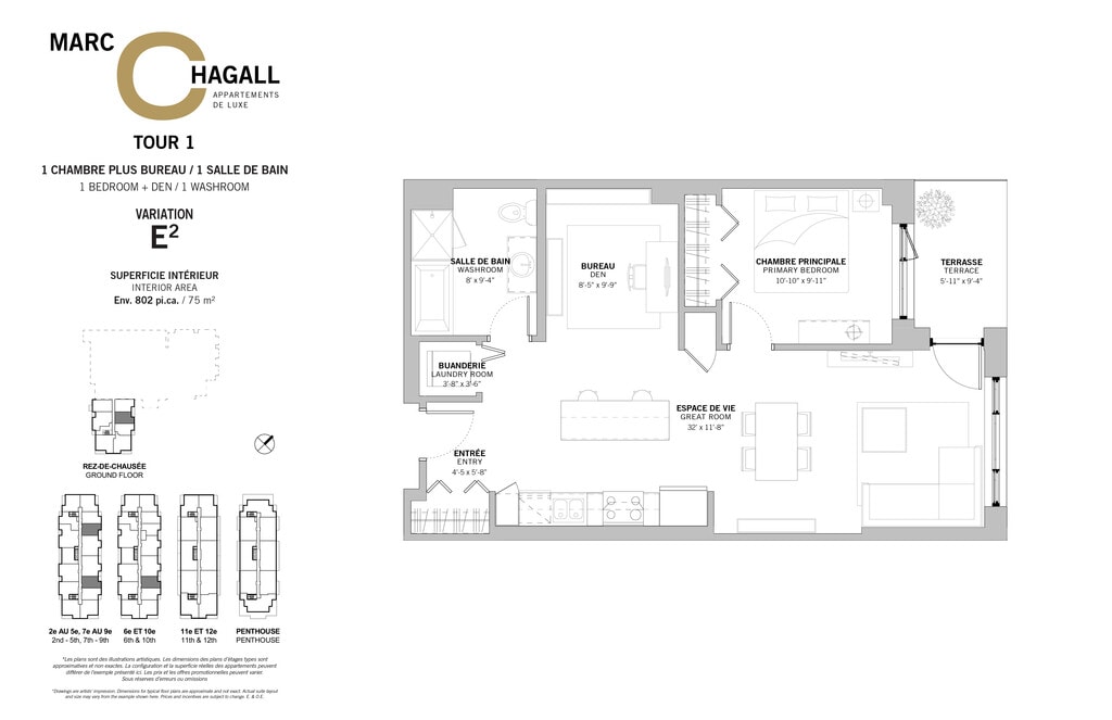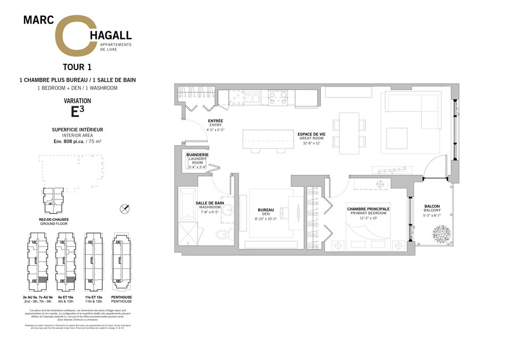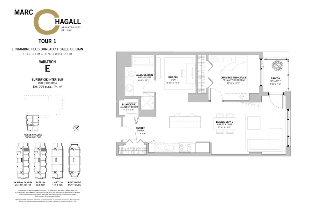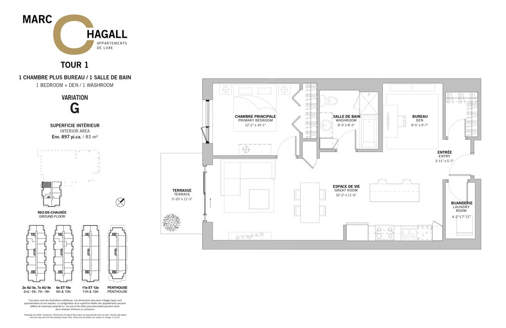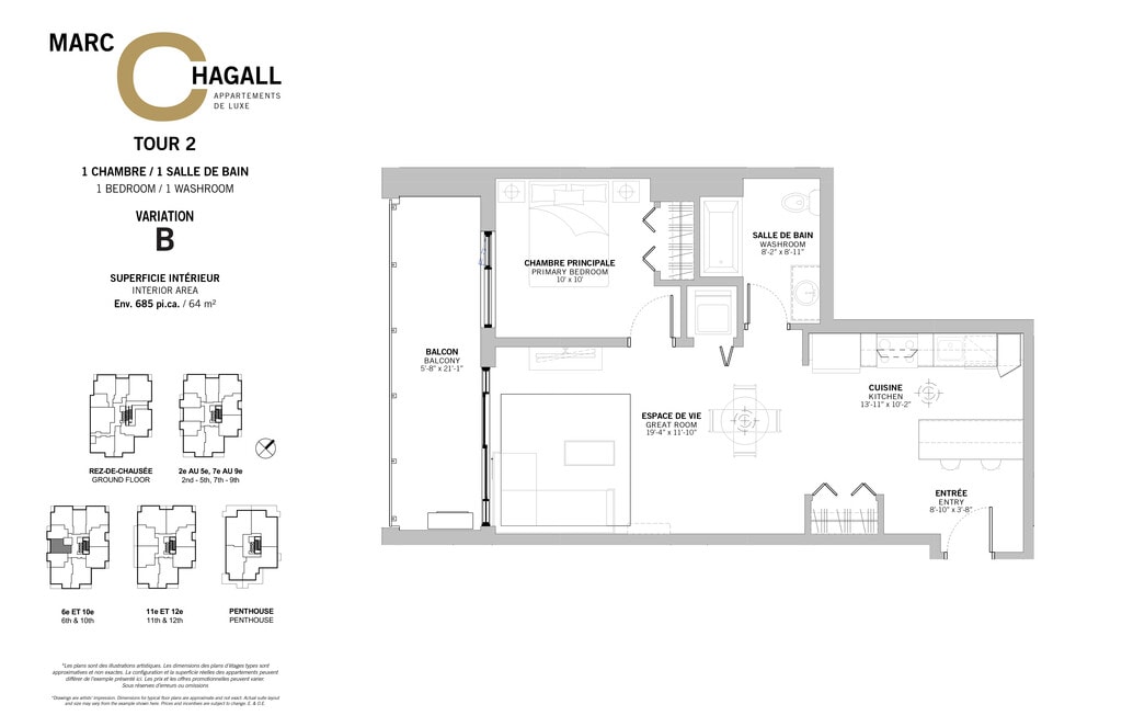 Marc Chagall offers 1 to 3 Bedroom apartments starting from C$1,860 and having 685–1,481 sq ft. Here is the current pricing and availability: