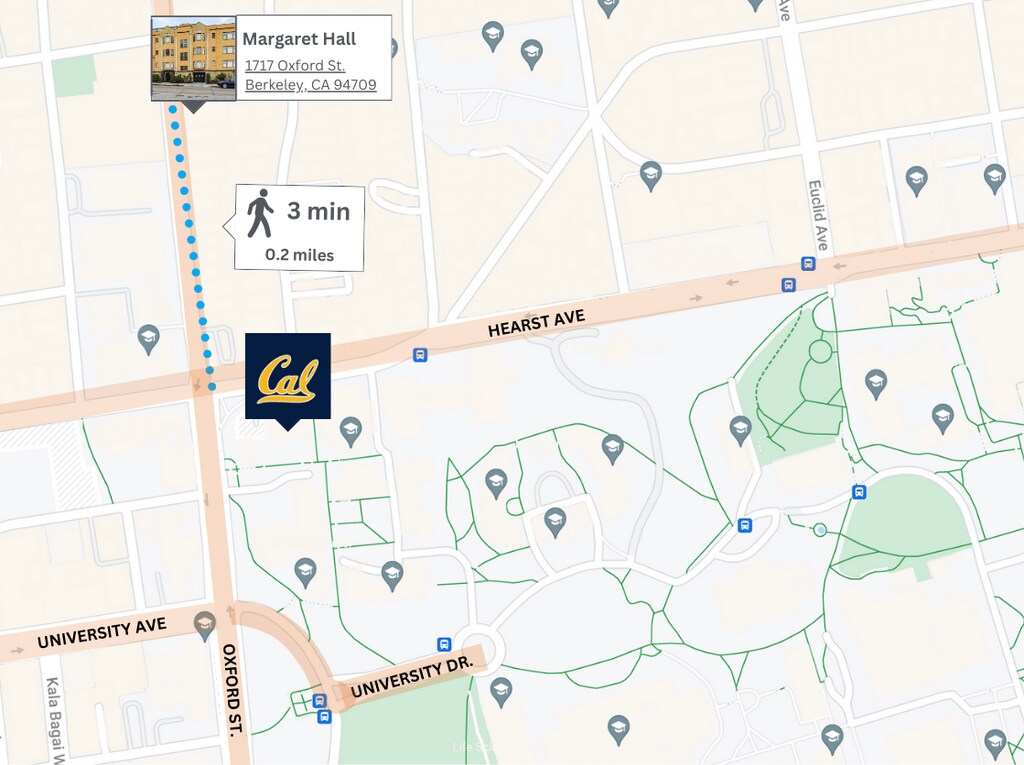 Spacious studio apartment One Block North of UCB 1717 Oxford is a quiet building conveniently located one block north of the UC Berkeley campus. This peaceful place to call home is within a short walking distance to many Shattuck Ave. shops, restaurants, and bars. Downtown Berkeley BART station and AC transit stops are within a 5 minutes' walk. The 30 apartments are spacious and sunny and the building also features a rooftop deck for resident's use that offers a spectacular view of the San Francisco Bay. Apartments have wood floors, nine foot ceilings, granite counter tops and radiant heat. All utilities are included except internet and there are laundry facilities on the 4th floor. Parking is for residents only at $100 monthly. This is a secure, non-smoking building that does not allow pets. *Virtual tour* of a similar unit *finishes vary: The building is managed by Square One Management, Inc., and we pride ourselves on taking resident requests seriously and creating a positive living environment and relationship with residents. Our application system and leasing process is all completed online and we have an easy online payment system so each resident can pay their portion of the monthly rent payment online. We are a local team with an office in downtown Berkeley. . Welcome to Margaret Hall at 1717 Oxford Way, a charming 30-unit apartment building that exudes classic Berkeley character and history. This gem is perfect for UC Berkeley students looking for an authentic Berkeley experience. It is conveniently located one block north of UC Berkeley campus and features a marvelous rooftop deck offering SPECTACULAR views of the San Francisco Bay. Within a short walks distance you will find the Downtown Berkeley BART station, AC transit stops and a variety of shops, restaurants, and bars. The apartments at Margaret Hall are SPACIOUS and sunny. We know you'll love it here! . Unbeatable Location Located just a stone's throw away from UC Berkeley, this apartment offers unparalleled convenience for students. Say goodbye to long commutes and hello to a stress-free campus life. With UC Berkeley within walking distance, you'll have more time to focus on your studies and immerse yourself in the vibrant campus community. . Local Amenities ? Your new home is surrounded by a plethora of local amenities. Need to stock up on groceries? Simply stroll a few blocks to the nearby Trader Joe's or Safeway for all your shopping needs. When hunger strikes, explore the diverse culinary scene right at your doorstep. Indulge in delicious bites from popular spots like Oasis Grill or grab a quick bite at Top Dog, a local favorite. . Places of Interest Beyond its unbeatable location for students, 1717 Oxford Way is also surrounded by interesting places worth exploring. Take a leisurely walk to the Berkeley Art Museum and Pacific Film Archive for a dose of culture or indulge in nature's beauty at the Botanical Garden. The vibrant Downtown Berkeley area is also just a short distance away, offering an array of shops, cafes, and entertainment options. . Unbeatable Rent Price We offer some of the most competitive rent prices in the area. . The building is managed by Square One Management, Inc., and we pride ourselves on taking resident requests seriously and creating a positive living environment and relationship with residents. Our application system and leasing process is all completed online and we have an easy online payment system so each resident can pay their portion of the monthly rent payment online. We are a local team with an office in downtown Berkeley. . Don't miss out on this incredible opportunity to live in a classic Berkeley apartment with unmatched character. Contact us now to schedule a viewing and secure your spot at 1717 Oxford Way! Contact us here: