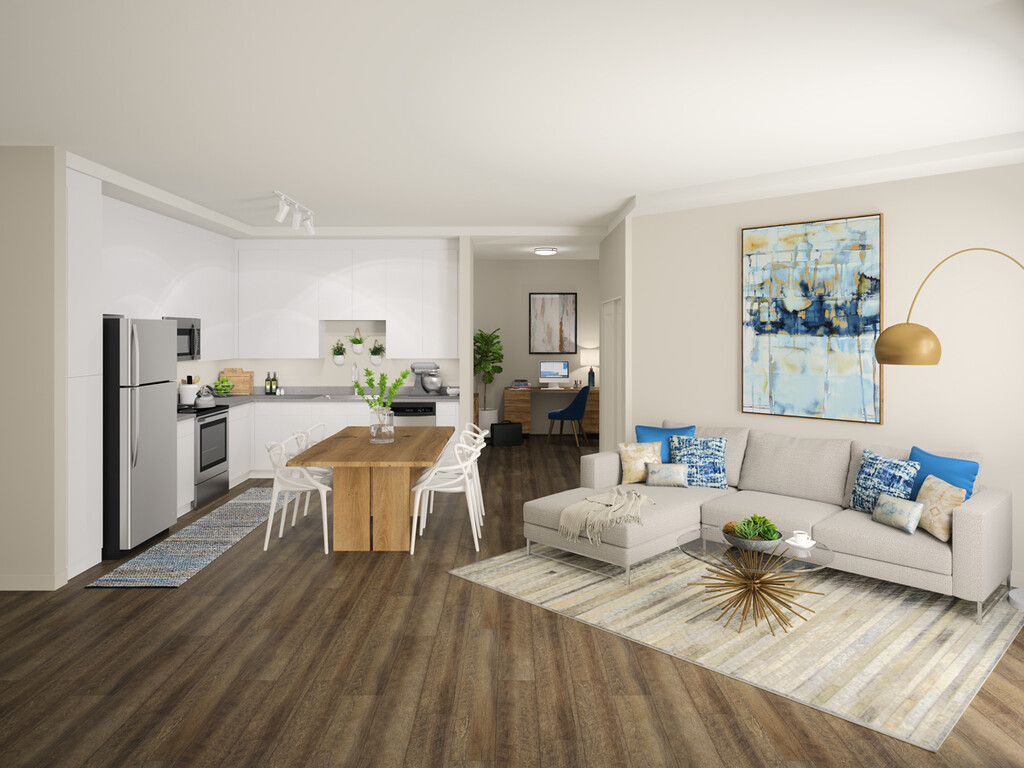 Modern open kitchen with cabinetry in white finish Quartz slab counter tops Energy Star® appliances by Frigidaire in stainless steel Faucets and fixtures by Kohler in satin nickel finish Luxury plank flooring throughout Bonus nook at entryway Full size washer and dryer by Electrolux Dual pane windows with 2” designer shades in white Central heat and air conditioning USB charging ports Schlage Smart Lock on entry door Square footage and apartment features may vary.