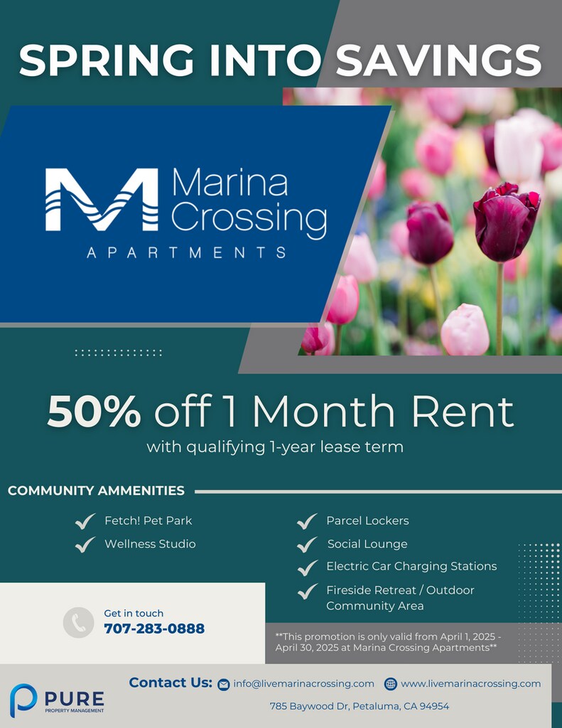 Marina Crossing Apartments are a short distance from Sonoma State University and provides the perfect blend of modern living with the historic charm and urban energy of Petaluma. Steps away from the Petaluma Marina and Shollenberger Park and a short distance to downtown Petaluma, you have immediate access to Sonoma County's outdoors and the exciting art, food and entertainment of Petaluma's thriving downtown. The Marina Crossing Apartments are the ideal location for connecting a rich and dynamic lifestyle, with a satisfying career. After a rewarding day of adventure in Sonoma County, the graciously well-appointed living spaces paired with modern amenities will invite you to unwind, socialize or whatever your mood fits. There is no better place to begin and end each day than Marina Crossing Apartments. Contact our leasing office to schedule a tour today! Call or text for more information or to arrange a tour. We’d love to show you around! Apartment Features: - Wood plank flooring and plush carpeting - Quartz slab counter tops - Energy Star ® appliance package by Frigidaire in stainless steel - Cabinetry in white finish - Full size W/D by Whirlpool - Central heat/air conditioning - USB charging ports Property Amenities: - Bike and Kayak storage - Controlled-access building - Wellness studio - Social lounge - On-Site Elevator Access - Wi-Fi connectivity in amenity spaces - Electric car charging stations - Smoke-free community Terms: - Flexible Lease Terms - Pet Friendly Visit our website and apply online! Phone: / Website: Phone/Email Customer Service Hours: Mon – Friday: 8:30 am – 5:30 pm