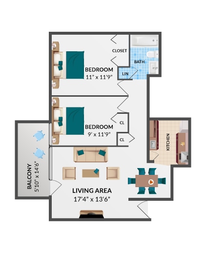 Apartment Model: B1P$1,3342 Bedroom, 1 Bath, 850 sq ftAvailable Now![]()