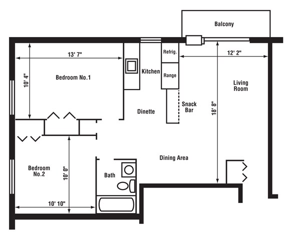 Apartment Model: 2 Bed, 1 BathFrom $1,1951 Bedroom, 1 Bath, 792-908 sq ftAvailable Now2 Bed, 1 Bath - Floorplan 1 2 Bedrooms