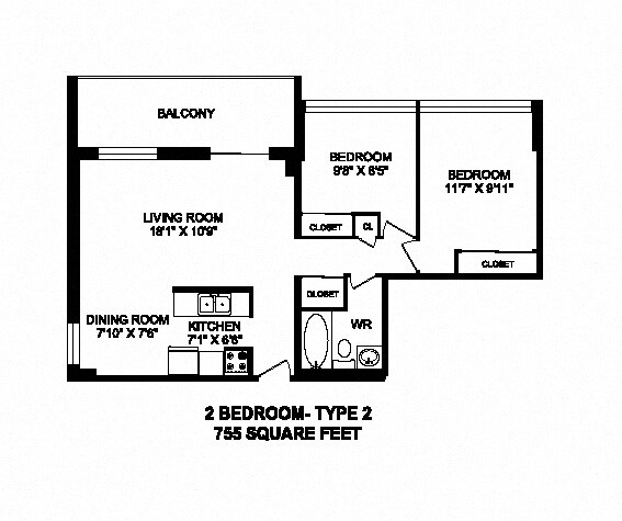 1 Bed 1 Bath D - Floorplan 1 2 Bedrooms