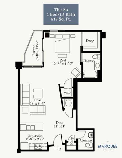 1 Bed, 1.5 Baths, 818 sq ftLargest 1 BedroomThis is the largest 1 Bedroom at this PropertyModel Gallery