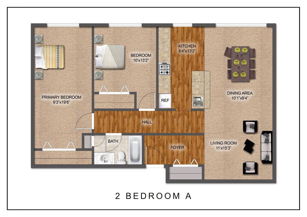 Two Bedroom A - Floorplan 1 Apartment Unit: 18Apartment Model: Two Bedroom A$1,4422 Bedroom, 1 Bath, 887 sq ftAvailable Now