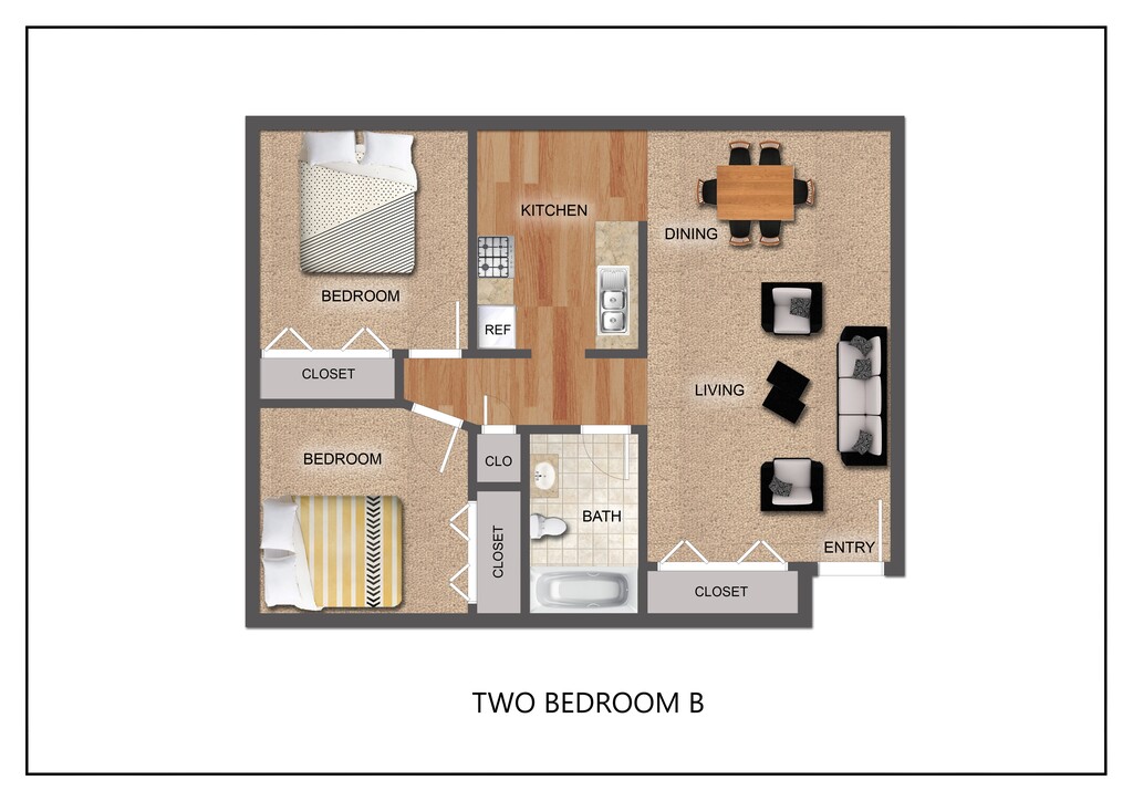 Apartment Model: Two Bedroom BFrom $1,3422 Bedroom, 1 Bath, 760 sq ftAvailable Now![]()