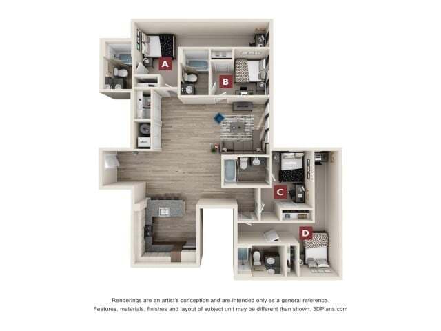 Arden - A1 - Floorplan 1 Apartment Unit: Double Occupancy Shared BedroomApartment Model: Arden - A1$9991 Bedroom, 1 Bath, 578 sq ftAvailable August 10, 20262 Bedrooms