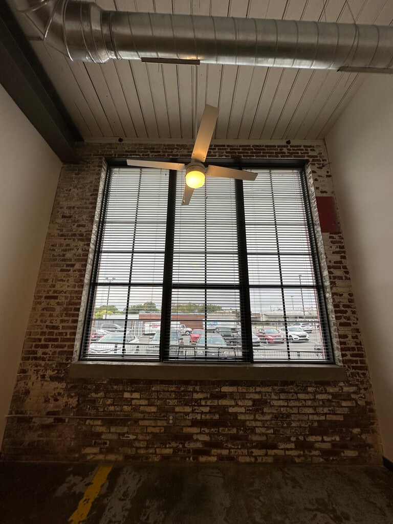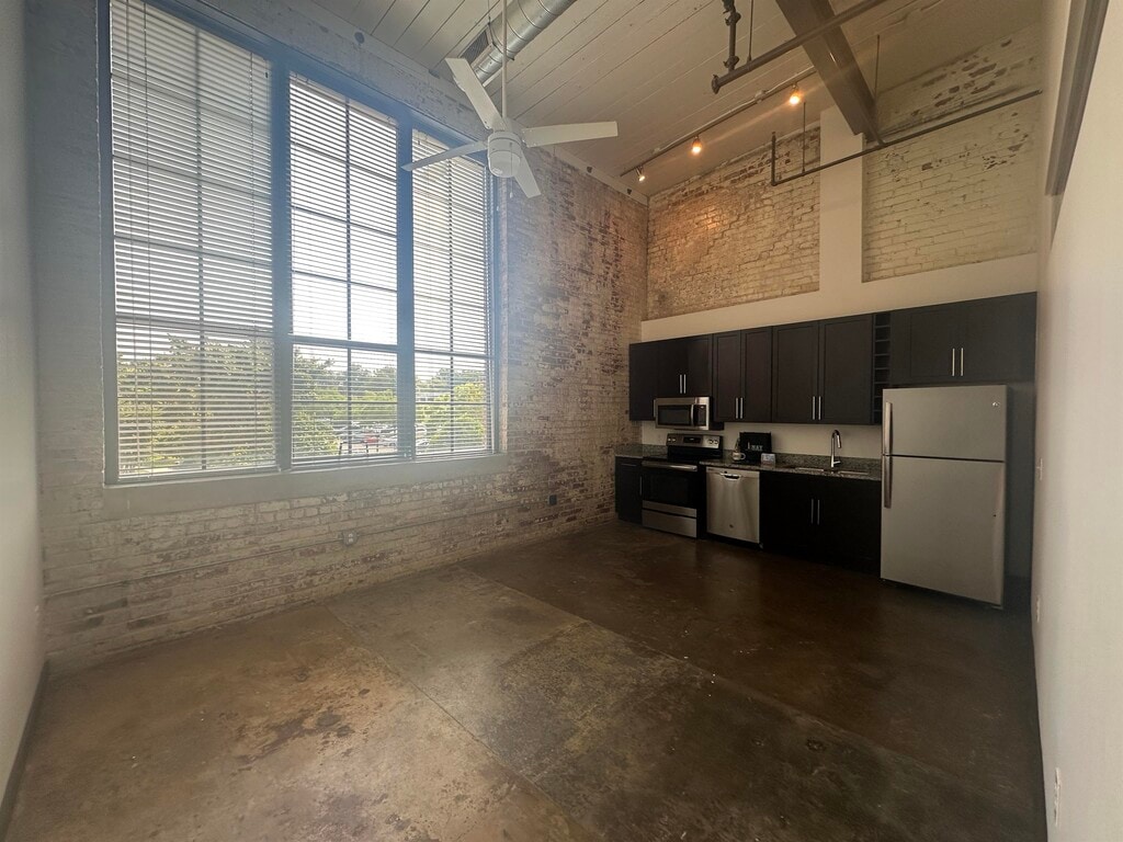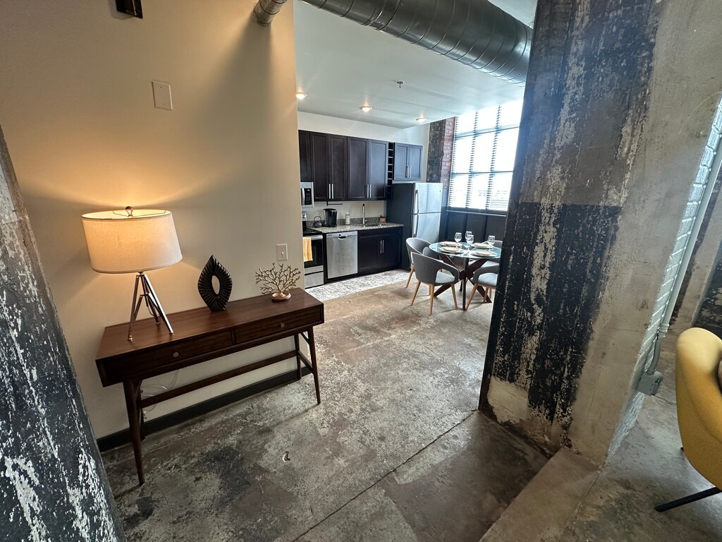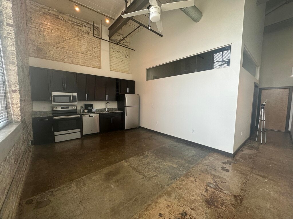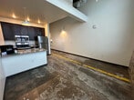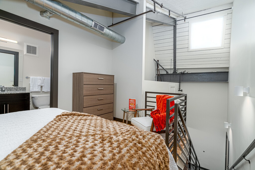 This loft apartment seamlessly blends industrial aesthetics with modern amenities. The open-concept layout maximizes space, showcasing exposed brick walls and soaring ceilings that add character. Large windows flood the area with natural light, enhancing the sense of spaciousness. The kitchen boasts contemporary cabinetry, stainless steel appliances, and a granite countertop. An in-unit washer/dryer offers practicality.