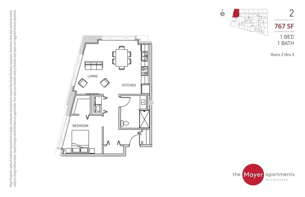 Mayer MKE offers 1 Bedroom apartments starting from $1,750 and having 767 sq ft. Here is the current pricing and availability: