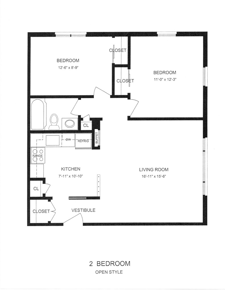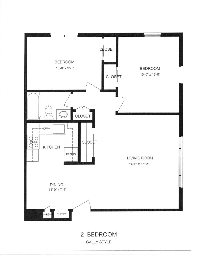 2.0 BR/ 1.0 BA Galley Style - Floorplan 1 2.0 BR/ 1.0 BA Open Style