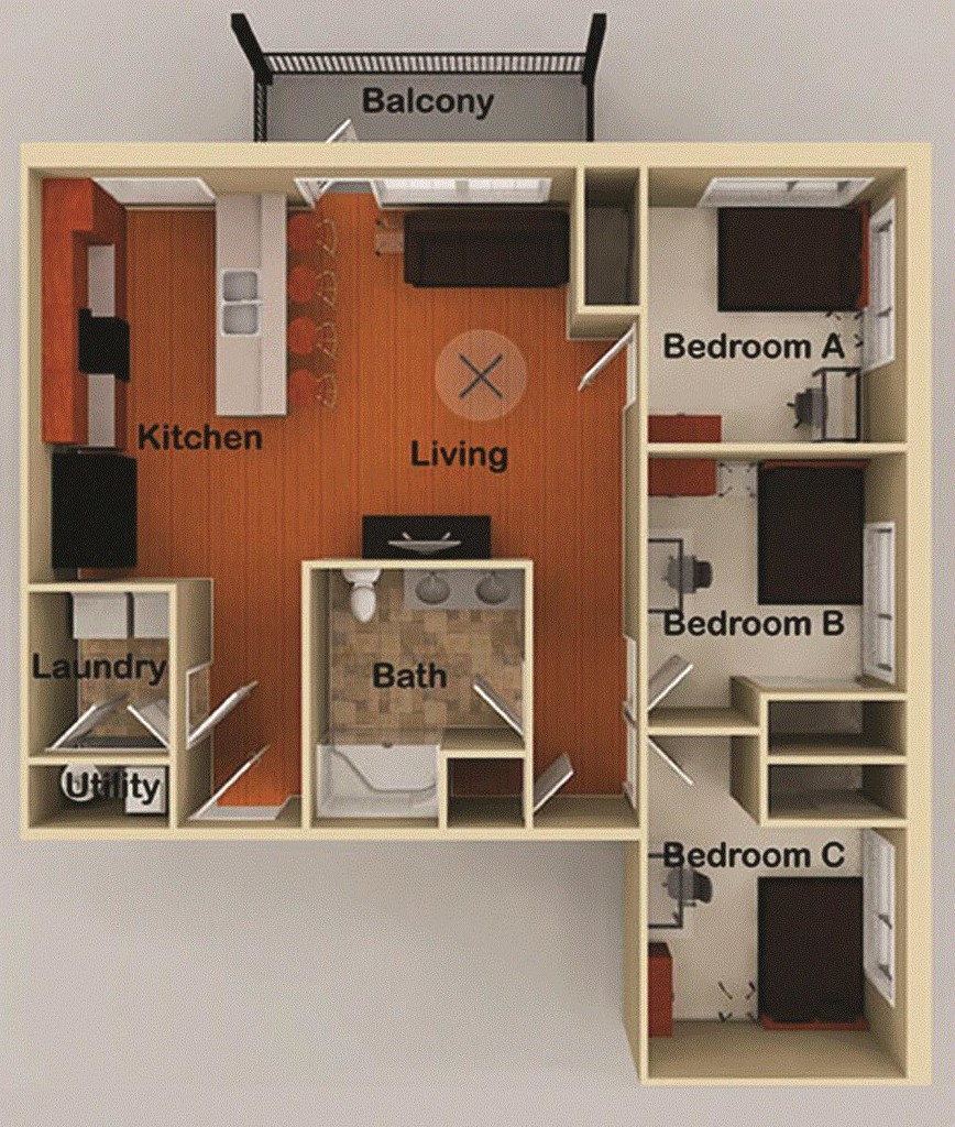 3x1 - Floorplan 1 Apartment Unit: PrivateApartment Model: 3x1$9953 Bedroom, 1 Bath, 1294 sq ftAvailable NowApartment Unit: PrivateApartment Model: 3x1$9953 Bedroom, 1 Bath, 1294 sq ftAvailable August 20, 20264 Bedrooms