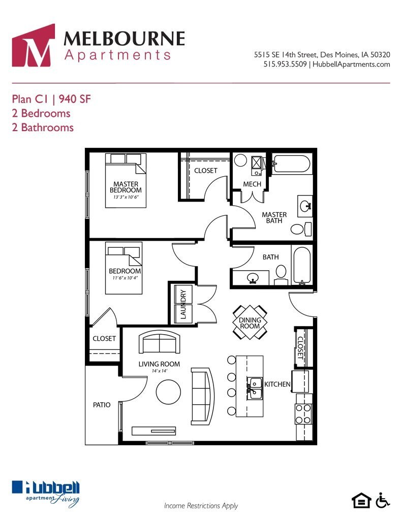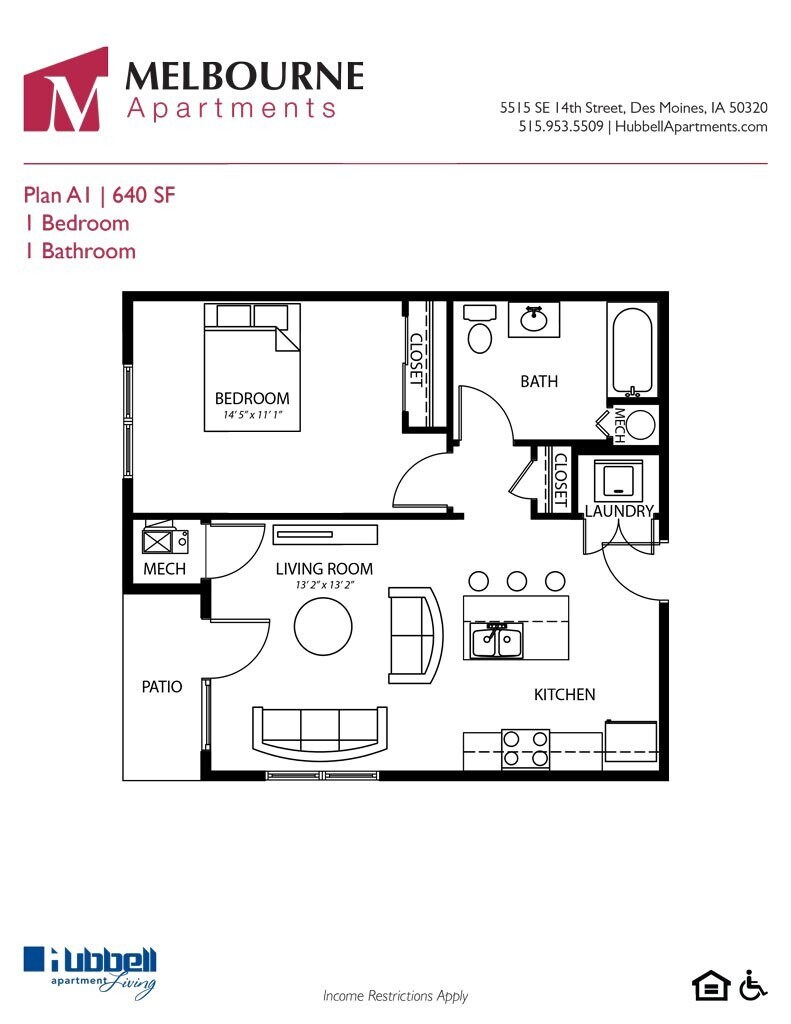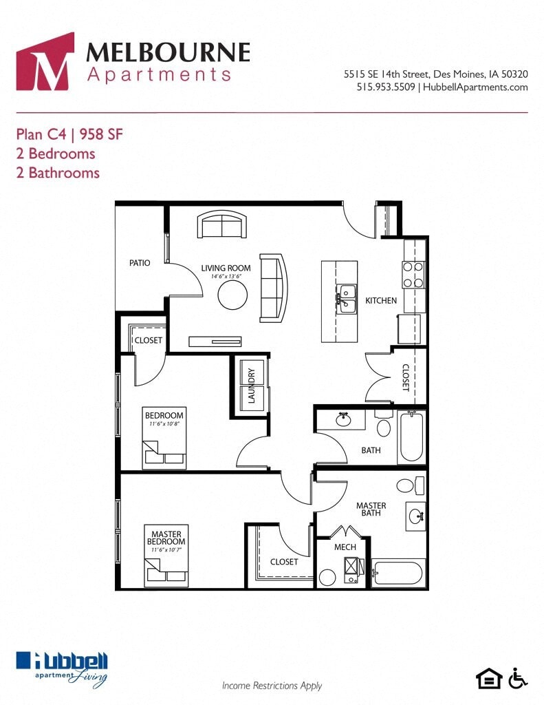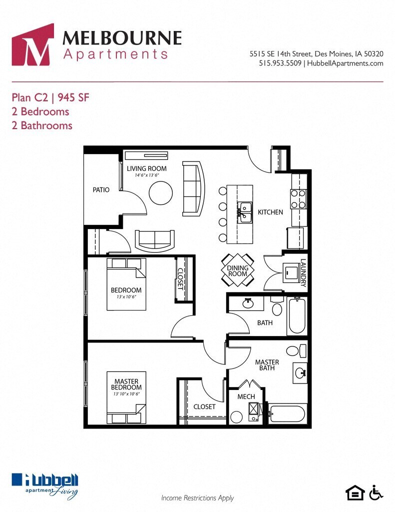 Beautiful Apartments in Des Moines CONVENIENT AMENITIES Spend quality time with your kids on our playground and splash pad, or take advantage of our clubhouse, business center and 24-hour gym. Here at Melbourne weve thoughtfully built amenities for both you and the family. SPACIOUS FLOOR PLANS With a variety of one-, two- and three-bedroom floor plans available, youll find an apartment layout that makes both you and your wallet happy. Come home to modern appliances, laminate wood flooring and a closet fit for a King or Queen. PHOTO GALLERY Take a look at what sets Melbourne apart from the rest by browsing through photos of our exciting community amenities and apartments that feel like home. Ready to see it all in person? Schedule a tour with one of our friendly staff members. We are glad that youre interested in living in Melbourne. To ensure that we can provide living opportunities for everyone, this community has an income qualification process. There are income limits per family size that cannot be exceeded to live here. Hubbell has many communities to find exactly what you are looking for when it comes to affordable options, and we encourage you to search our website if you dont qualify for this income-restricted community. Please call to ask our leasing team about the income specifics and wed be happy to answer questions you might have!