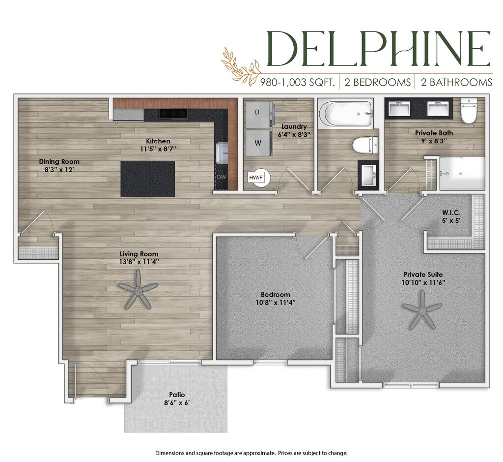 Apartment Model: DelphineFrom $1,8042 Bedroom, 2 Bath, 1003 sq ftAvailable November 4, 2025FloorplansPhotos![]()