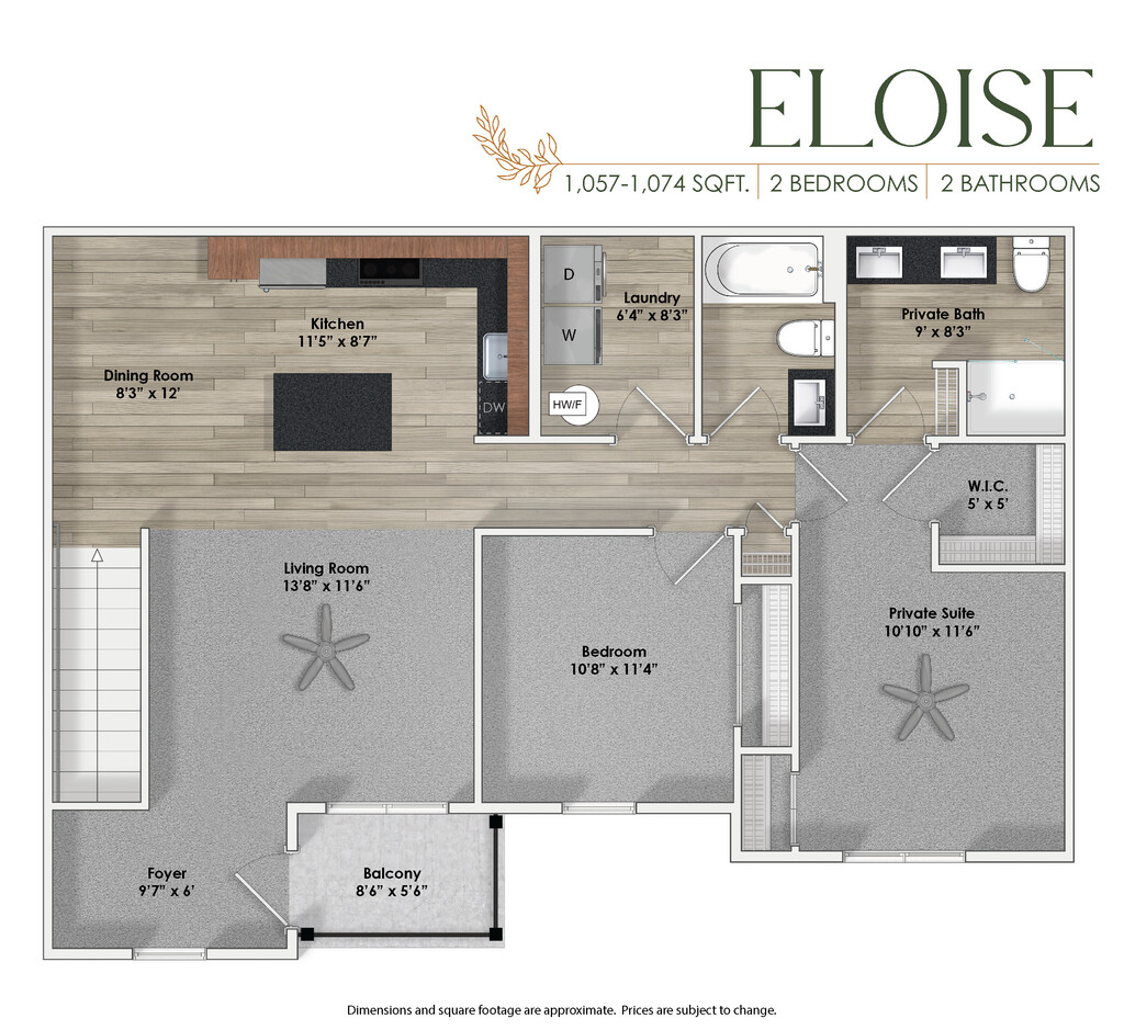 Apartment Model: EloiseFrom $1,8842 Bedroom, 2 Bath, 1074 sq ftAvailable NowFloorplansPhotos![]()