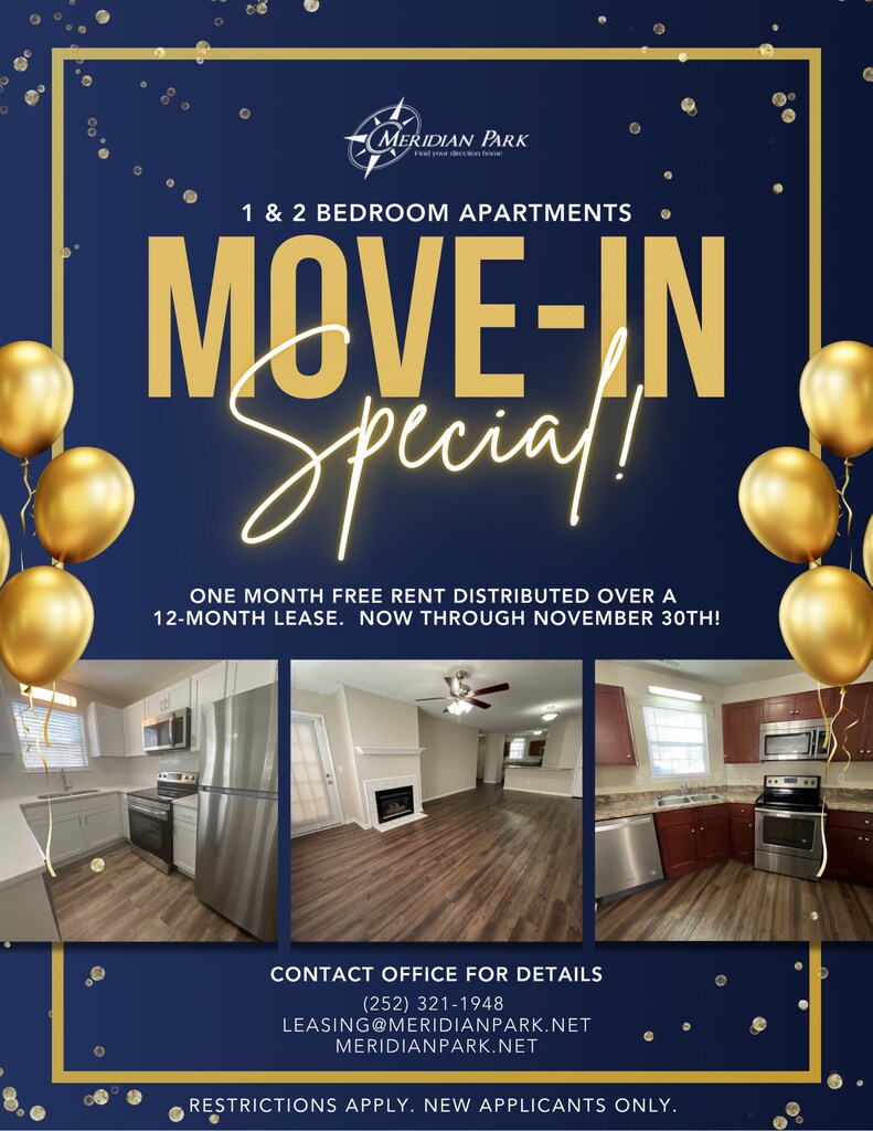 July 24, 2015Aye Aye matey! Welcome aboard to USS Meridian Park aka my new home! Home to the ECU pirates this apartment is a welcome treat. Friendly staff starts the tour and helpfulness is key. Large one and two bedroom apartments feel more like a home. Spacious bedrooms, bathrooms, and closets make the living easy. The apartment features many amenities including a lavish pool perfect for a summer swim, fully equipped exercise room, tennis court,and a fully stocked movie rental station to rent all your ...favorite DVDs! You'll find that the treasure chest lies within. You'll be the envy of all your fellow sail mates! Prepare to be boarded and relax and enjoy this gem of East Carolina!Read MoreReview from Apartments.com