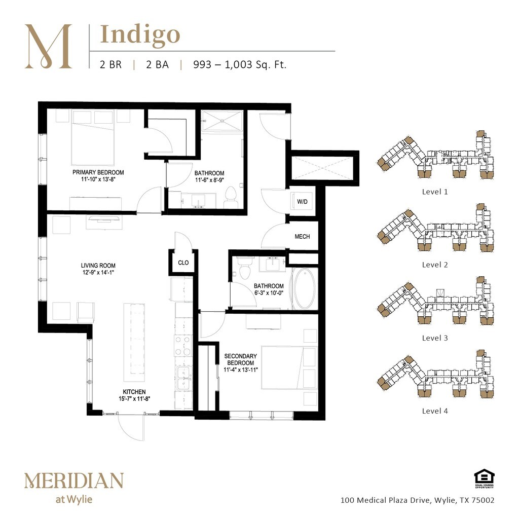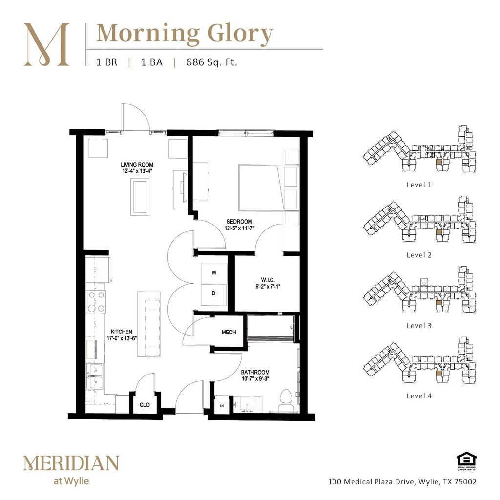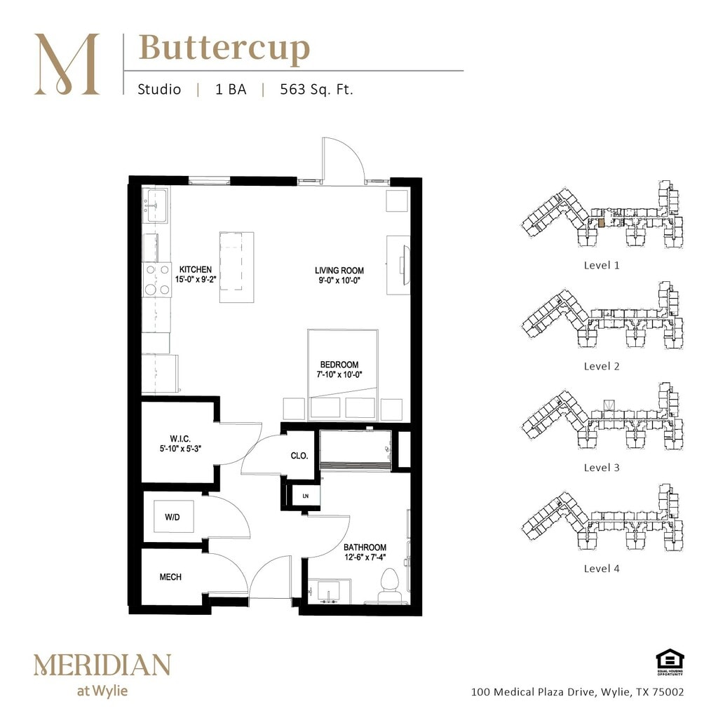 Meridian at Wylie - 55+ Affordable Apartments offers Studio to 2 Bedroom apartments starting from $1,375 and having 618–1,075 sq ft. Here is the current pricing and availability: