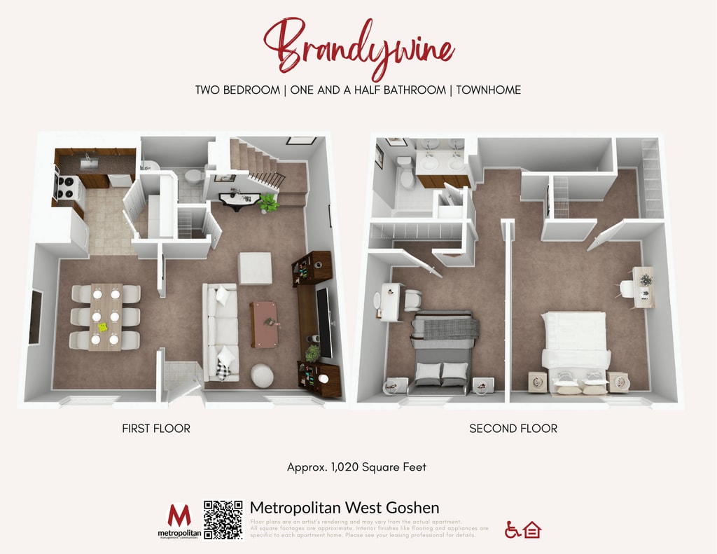 Apartment Model: Brandywine Townhome | 2 Bedroom, 1.5 BathFrom $1,9752 Bedroom, 1.5 Bath, 1020 sq ftAvailable NowFloorplansPhotos![]()