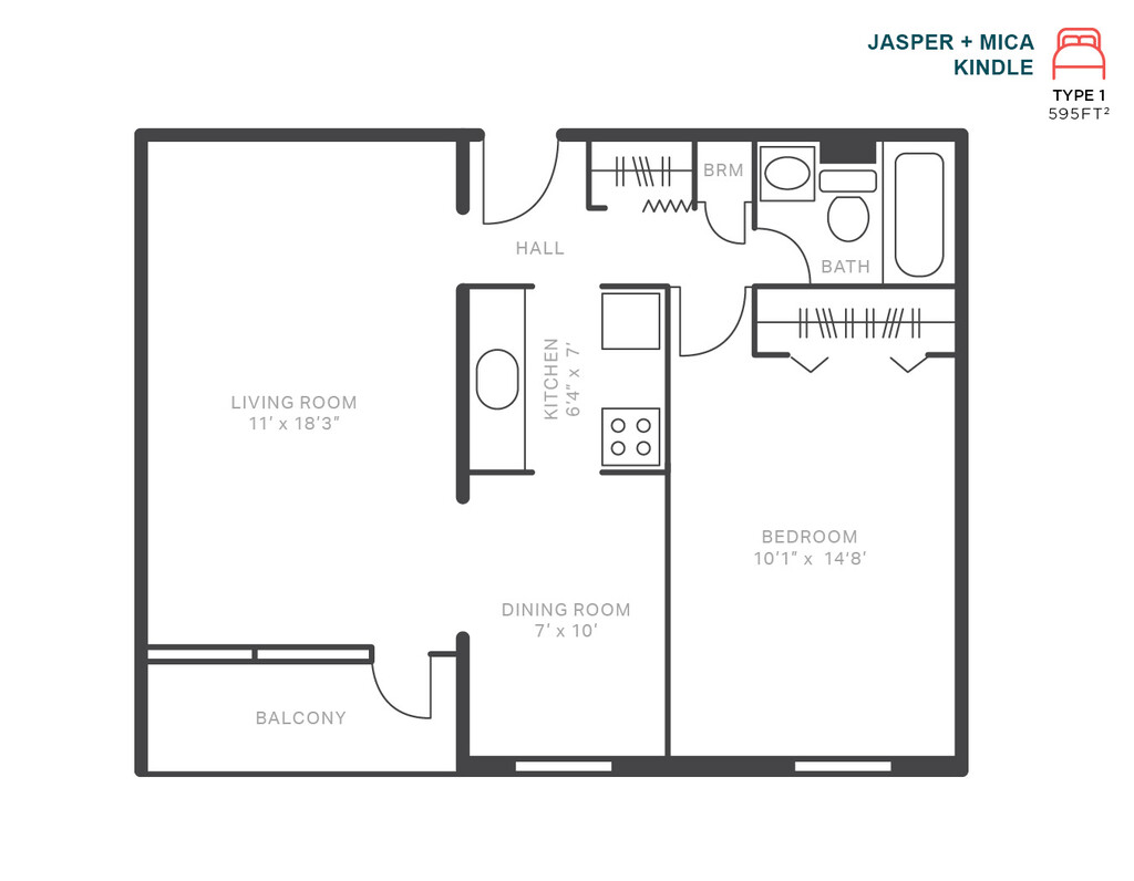 Apartment Model: Kindle 1_11 Bedroom, 1 Bath, 595 sq ftAvailable December 8, 2025FloorplansPhotos![]()
