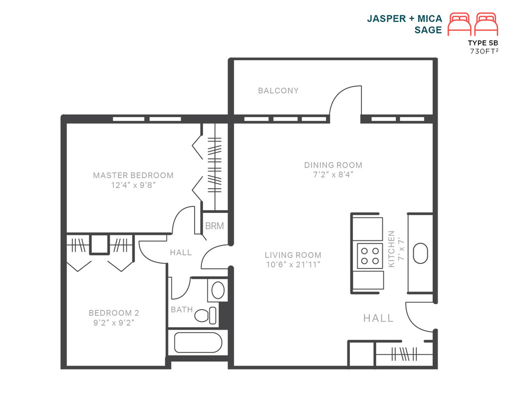 Ruby 2_4 - Floorplan 11 Apartment Unit: 0208Apartment Model: Ruby 2_42 Bedroom, 1 Bath, 730 sq ftAvailable NowApartment Unit: 0408Apartment Model: Ruby 2_42 Bedroom, 1 Bath, 730 sq ftAvailable Now