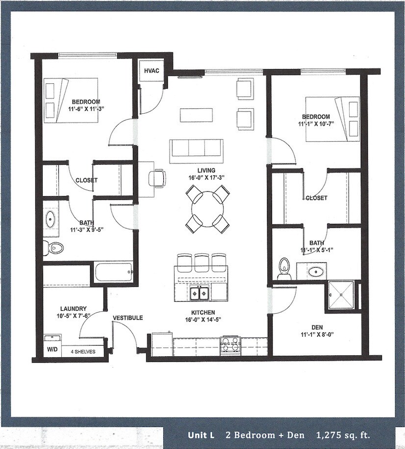 Apartment Model: 1 - JFrom $2,2542 Bedroom, 2 Bath, 983 sq ftAvailable Now![]() - 1 - J - Floorplan 1 - 2 - L + Den- From $2,7662 Beds, 2 Baths, 1275 sq ftAvailable NowLargest 2 BedroomThis is the largest 2 Bedroom at this Property- Model Gallery- Floorplans- Availability Details- Price - Availability Date - Unit - Sq Ft - From $2,766 - Available Now - 2 - L + Den - 1275 sq ft - Model Amenities and Features- Features- Air Conditioning