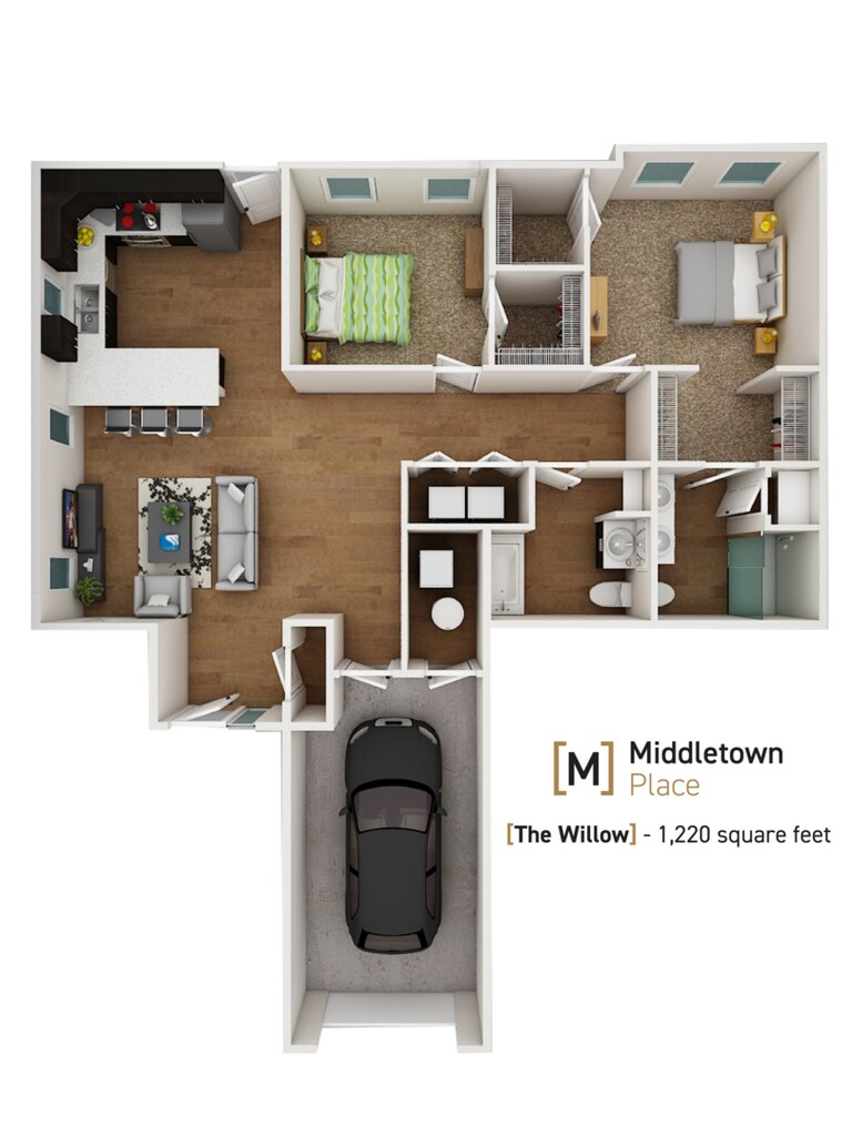 Apartment Model: Willow with Vaulted Ceilings2 Bedroom, 2 Bath, 1220 sq ftAvailable June 7, 2026FloorplansPhotos![]()