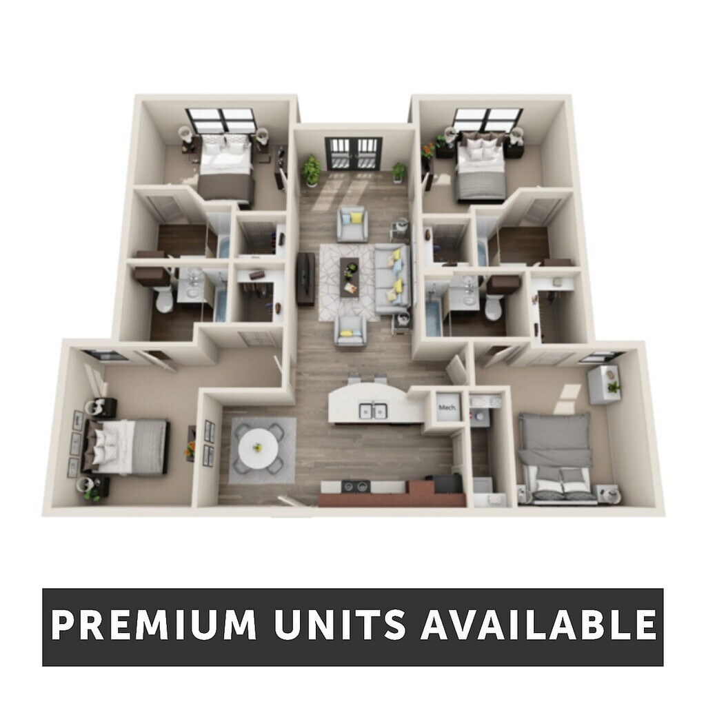 4x4 - Standard - Floorplan 2 Apartment Unit: Private PremiumApartment Model: 4x4 - Standard4 Bedroom, 4 Bath, 1460 sq ftAvailable August 14, 20264x4 - VIP