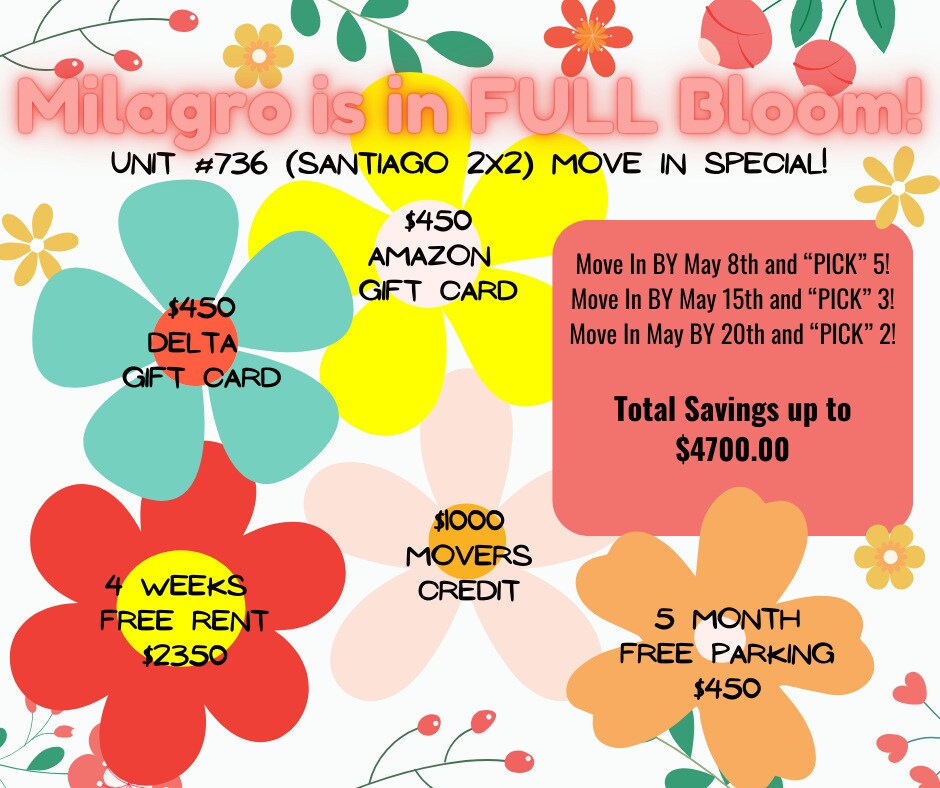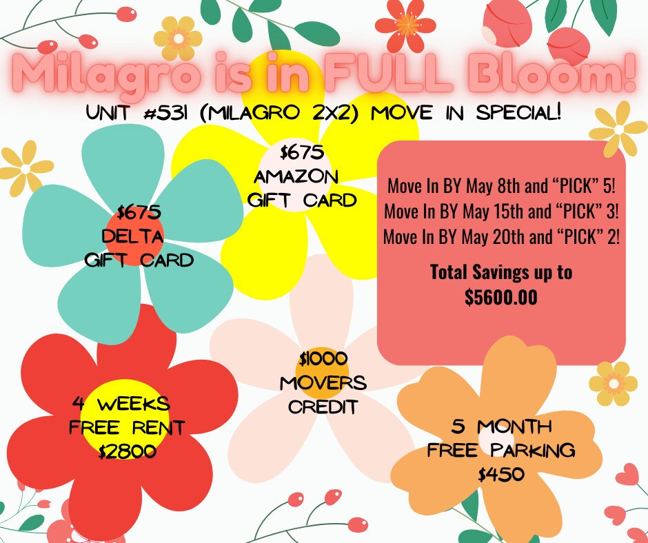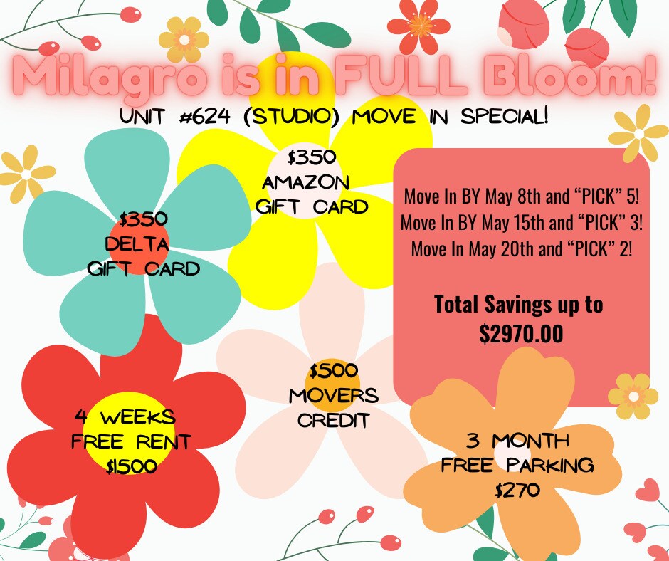 Milagro offers Studio to 2 Bedroom apartments starting from $1,395 and having 450–1,150 sq ft. Here is the current pricing and availability: