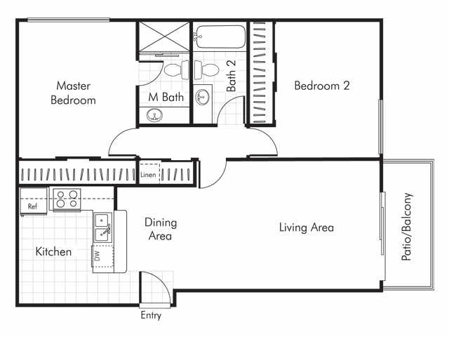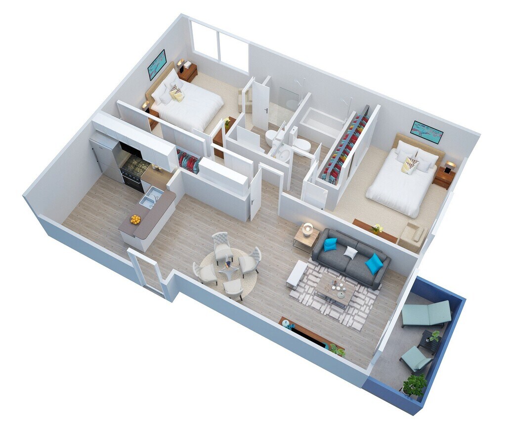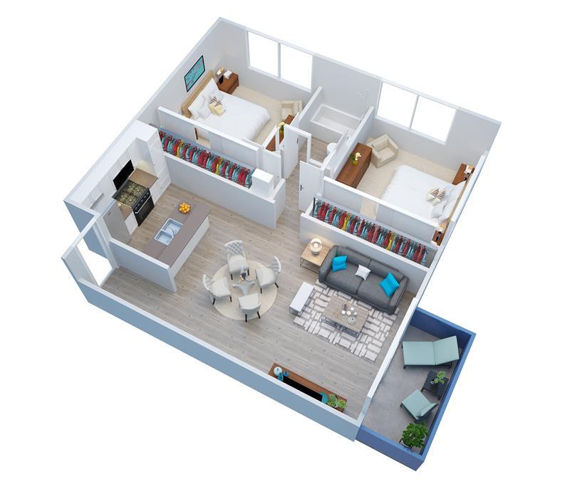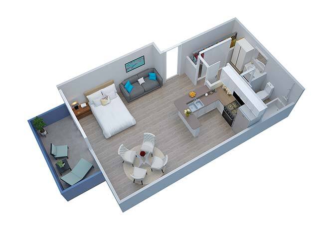- Studio, One, and Two Bedroom Layouts