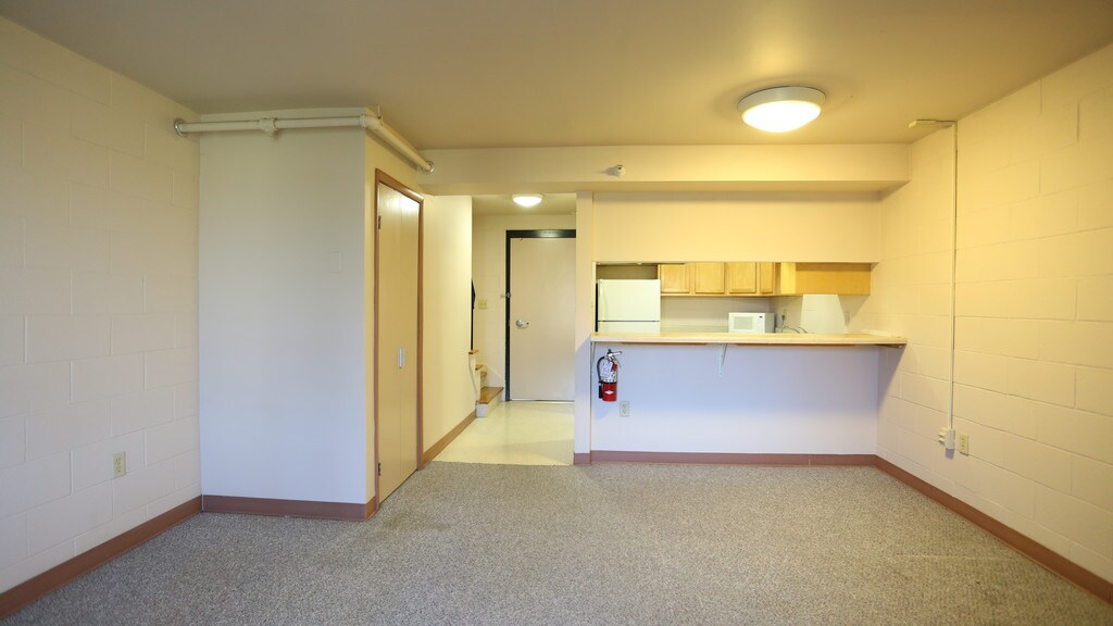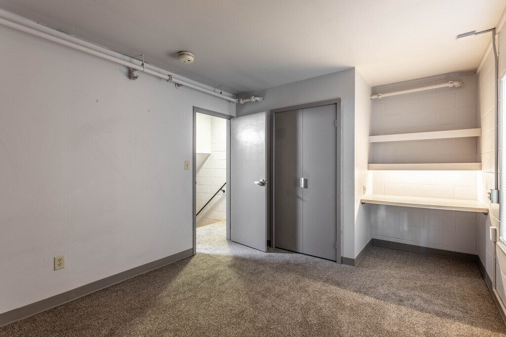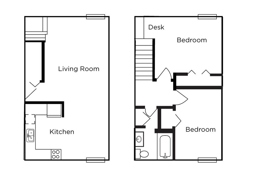 The townhome style with bedrooms and bathroom upstairs and living, cooking, and entertaining space downstairs. This apartment features breakfast bar dining area, built in desk or vanity in the bedroom, storage closet under the stairs, and built in linen cupboards near the bathroom. All utilities and wi-fi are included. Contact our leasing office for more details.
