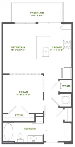 Studio A1 - Floorplan 1 Floor plans are artist's rendering. All dimensions are approximate. Actual product and specifications may vary in dimension or detail. Not all features are available in every rental home. Prices and availability are subject to change. Base rent is based on monthly frequency. Additional fees may apply, such as but not limited to package delivery, trash, water, amenities, etc. Deposits vary. Please see a representative for details.