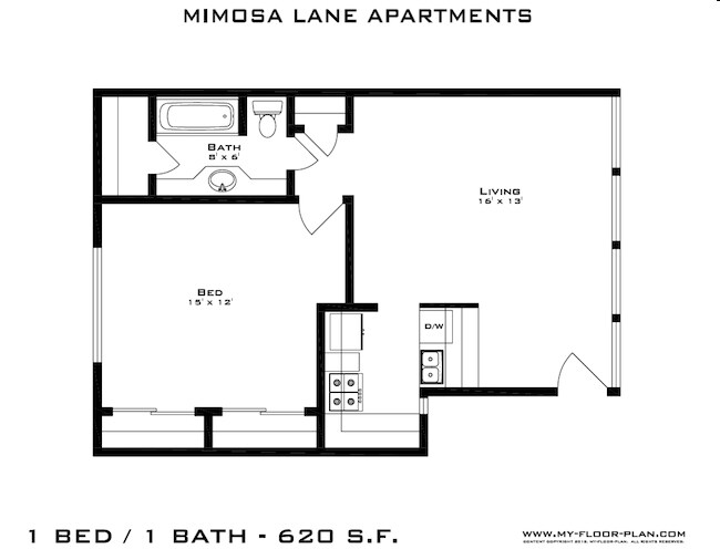 1 Bed, 1 bath - Floorplan 1 2 Bedrooms
