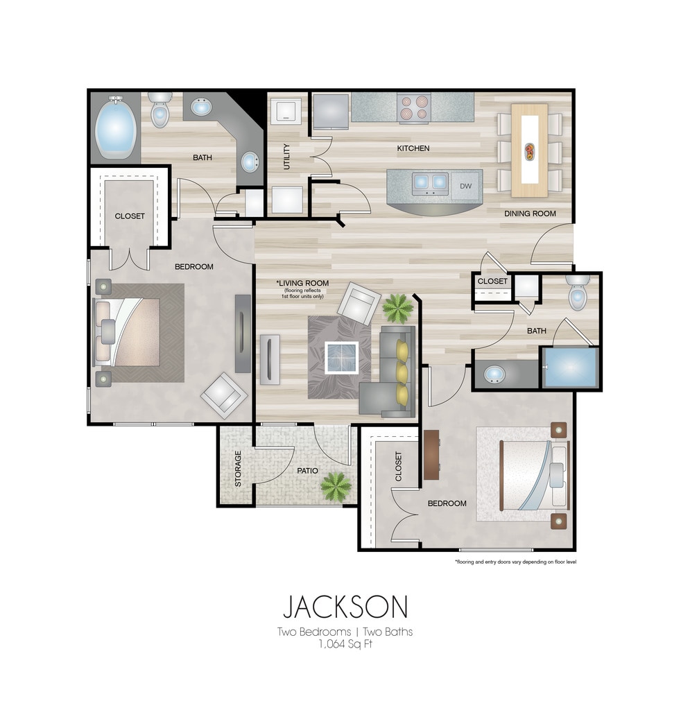 Apartment Model: JacksonFrom $1,3552 Bedroom, 2 Bath, 1064 sq ftAvailable NowFloorplansPhotos![]()