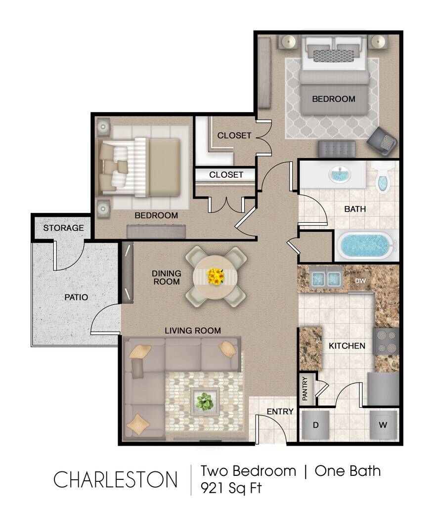 Apartment Model: CharlestonFrom $9502 Bedroom, 1 Bath, 921 sq ftAvailable NowFloorplansPhotos![]()