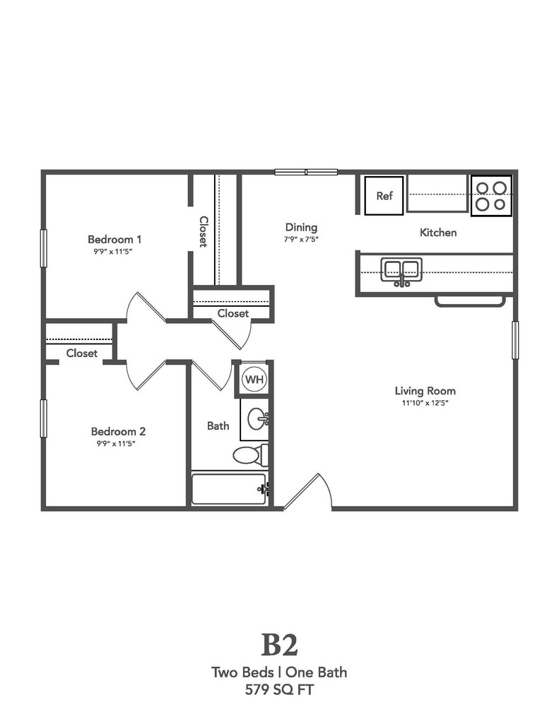 2 Beds, 1 Bath, 579 sq ftModel Gallery