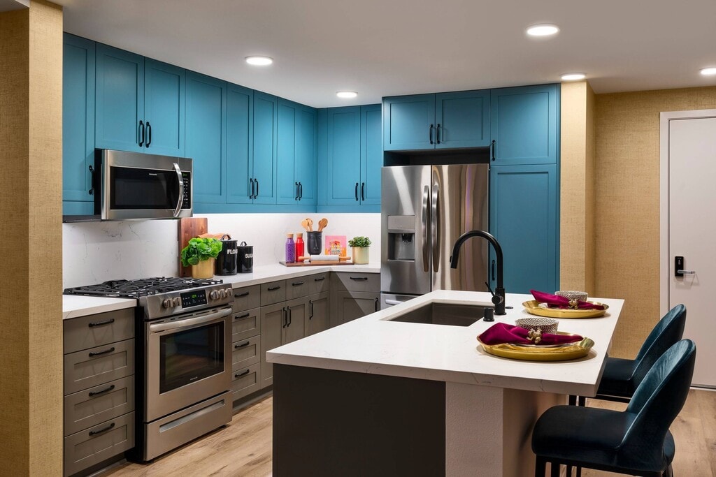 - Contemporary slab or shaker cabinetry with modern color palettes and soft closing cabinet hinges