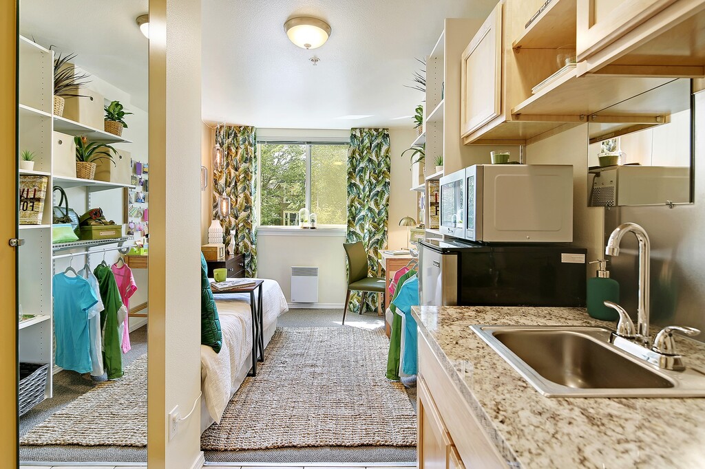 aPodment® studios at Modena are conveniently located near the bustling intersection of East Madison Street and 23rd Avenue East. Capitol Hill and the Madison Valley are just a stone’s throw in either direction, while downtown Seattle and the University of Washington are both a quick bus ride away. Modena has a variety of unique aPodment layouts — some trim and triangular, some with several windows and private decks, and all smartly crafted with careful attention to the details that will make you feel right at home. Each aPodment Suite is furnished with a kitchenette, bed, desk, and chair at no extra cost. The full-sized common kitchen is spacious and bright, there’s a peaceful picnic area out back, and our onsite janitorial service keeps the building spotless so you can forget about messy roommates! With views of Mt. Rainier to the south and the Cascades to the east, and a Walk Score of 86, Modena is truly a haven in the heart of the city.