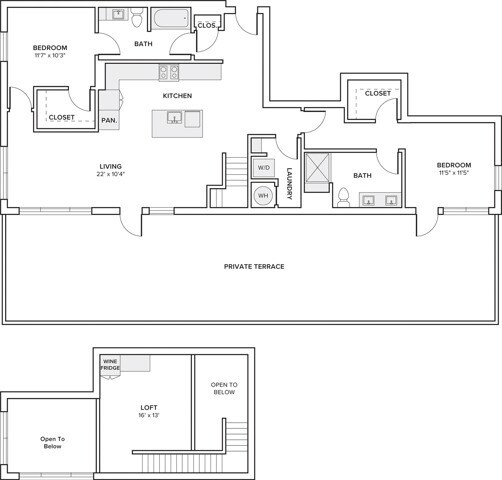 - Studio, 1-, 2-, and 3-bedroom homes with loft layouts