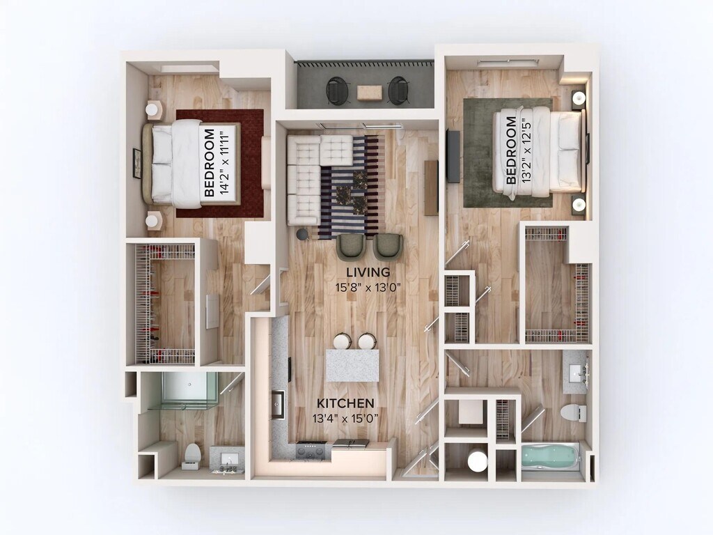 - Designer bathrooms with quartz countertops and custom cabinetry