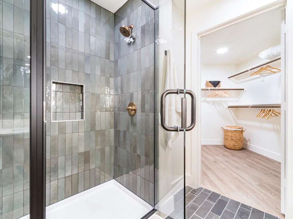 - Frameless glass showers with floor-to-ceiling tile surrounds*