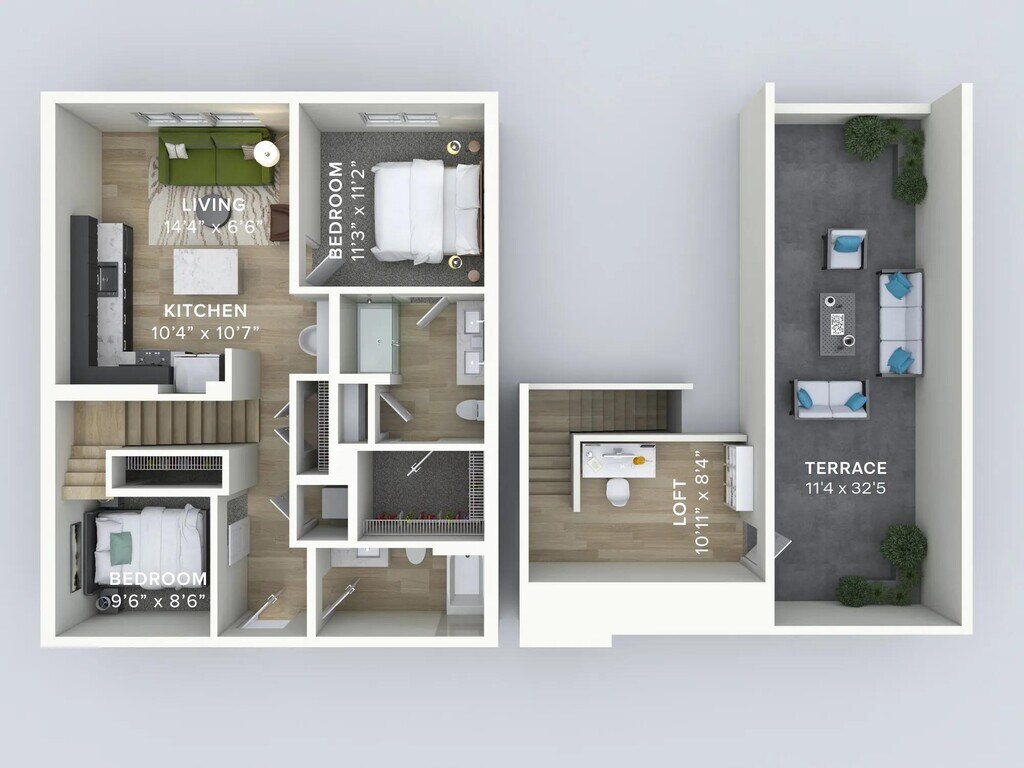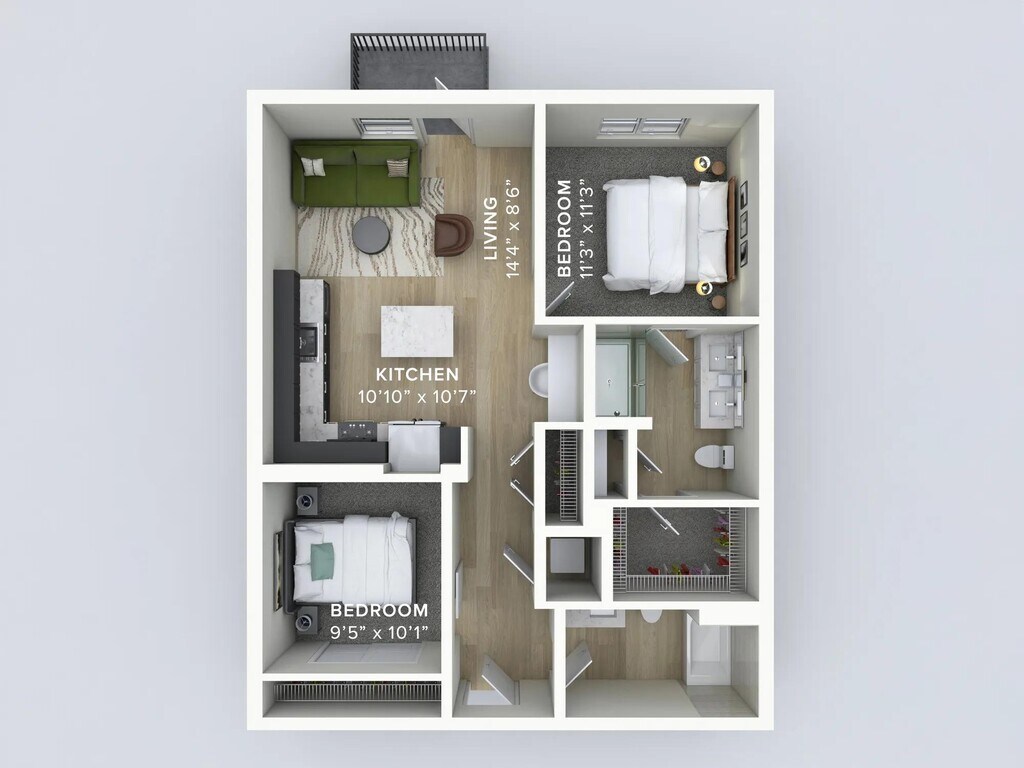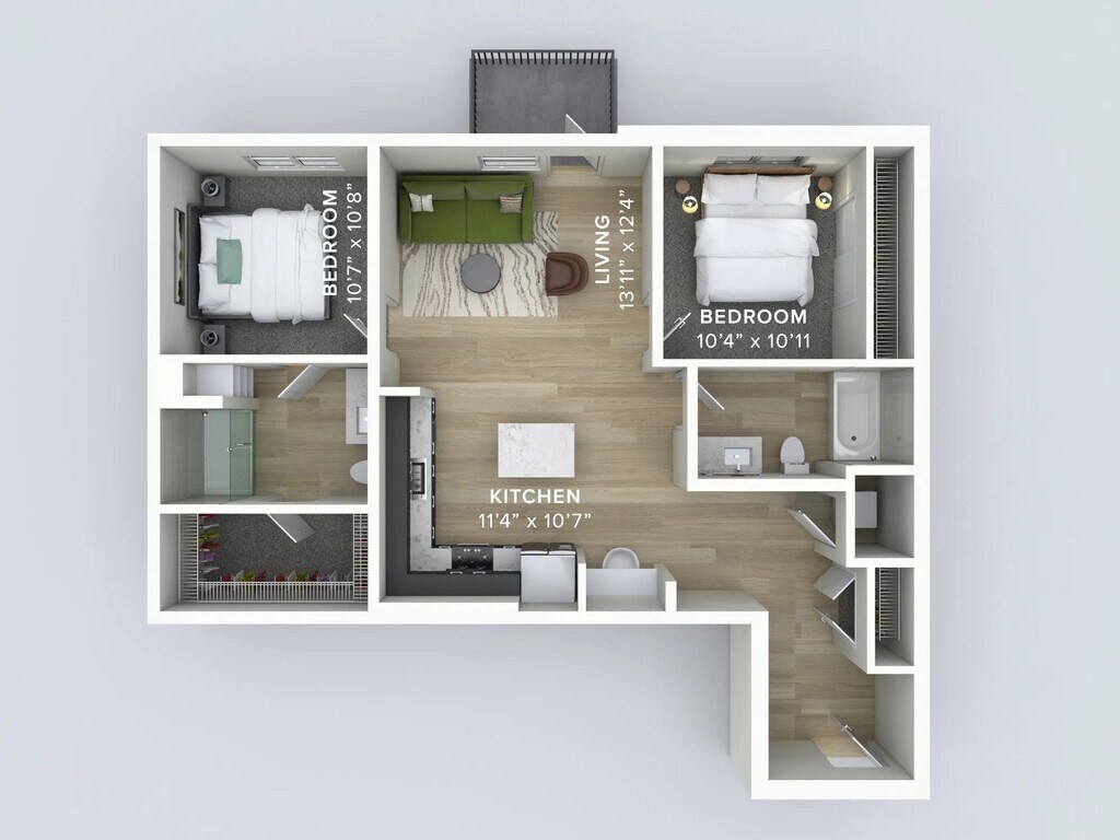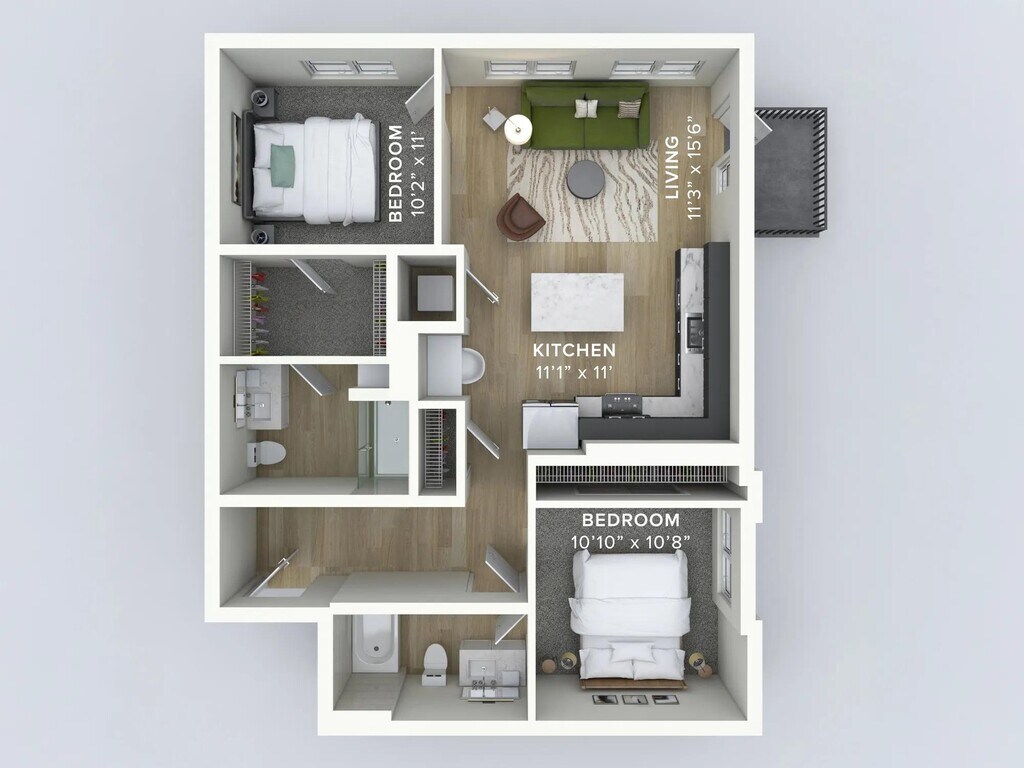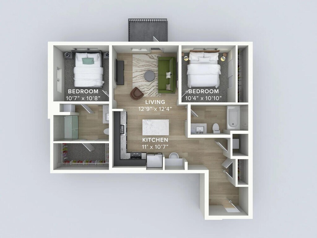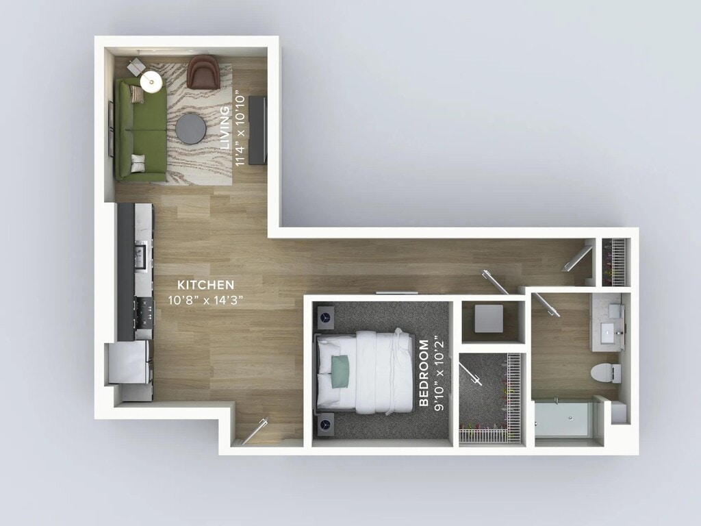 Modera University Park offers 1- and 2-bedroom apartment homes, with den and loft layouts available. Choose between two distinctive finish packages - light and dark - to fit your preferences. Gourmet kitchens feature quartz countertops, soft-close cabinetry, and under-cabinet lighting, while designer bathrooms include spa-inspired soaking tubs and double vanities. Spacious custom closets, private balconies, and select homes with sweeping city or mountain views complete the experience. Modera University Park delivers expertly curated apartment homes tailored for sophisticated Denver living.