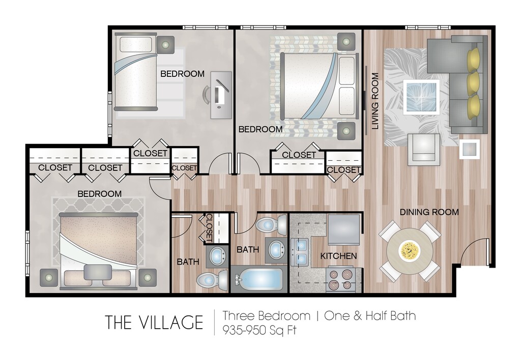 Apartment Model: The Village - 3 BedroomFrom $1,4003 Bedroom, 1.5 Bath, 935-950 sq ftAvailable Now![]()